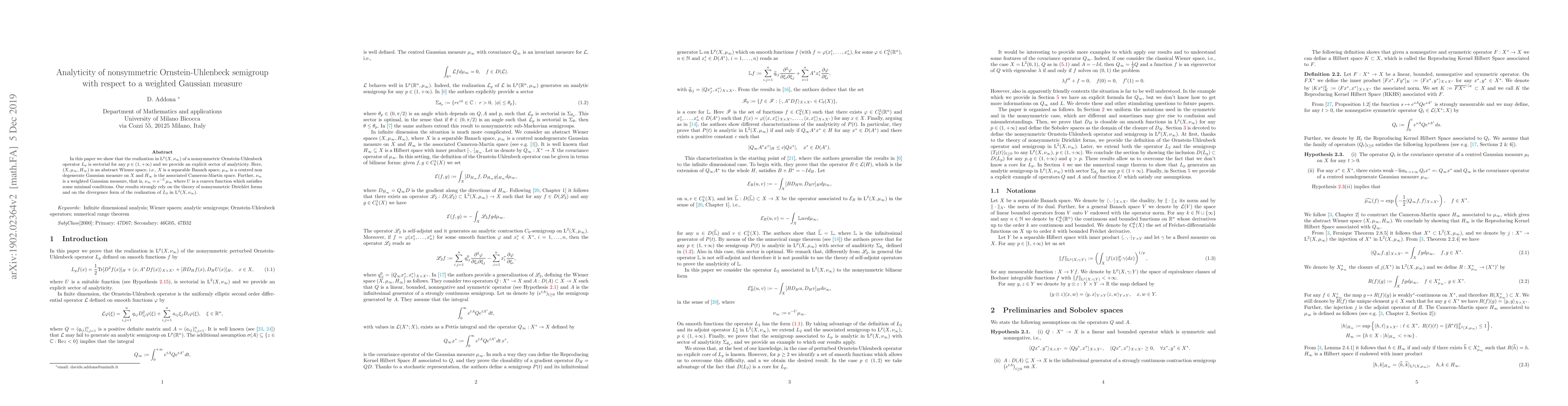 In this paper we show that the realization in $L^p(X,\nu_\infty)$ of the nonsymmetric Ornstein-Uhlenbeck operator $L$ is sectorial for any $p\in(1,+\infty)$ and we provide an explicit sector of analyticity. Here $(X,\mu_\infty,H_\infty)$ is an abstract Wiener space, i.e., $X$ is a separable Banach space, $\mu_\infty$ is a centred non degenerate Gaussian measure on $X$ and $H_\infty$ is the associated Cameron-Martin space. Further, $\nu_\infty$ is a weighted Gaussian measure, that is, $\nu_\infty=e^{-U}\mu_\infty$ where $U$ is a convex function which satisfies some minimal conditions. Our results strongly rely on the theory of nonsymmetric Dirichlet forms and on the divergence form of the realization of $L$ in $L^2(X,\nu_\infty)$.