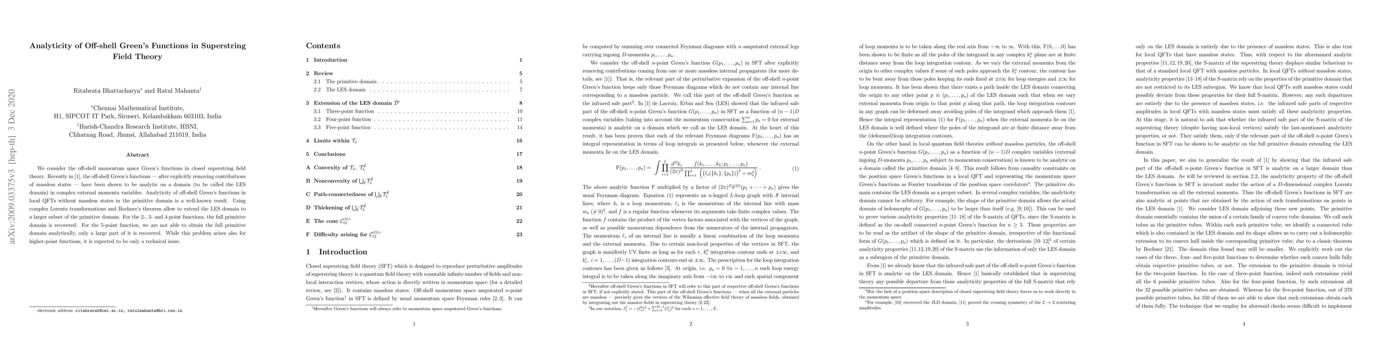 We consider the off-shell momentum space Green's functions in closed superstring field theory. Recently in arXiv:1810.07197, the off-shell Green's functions -- after explicitly removing contributions of massless states -- have been shown to be analytic on a domain (to be called the LES domain) in complex external momenta variables. Analyticity of off-shell Green's functions in local QFTs without massless states in the primitive domain is a well-known result. Using complex Lorentz transformations and Bochner's theorem allow to extend the LES domain to a larger subset of the primitive domain. For the 2-, 3- and 4-point functions, the full primitive domain is recovered. For the 5-point function, we are not able to obtain the full primitive domain analytically, only a large part of it is recovered. While this problem arises also for higher-point functions, it is expected to be only a technical issue.