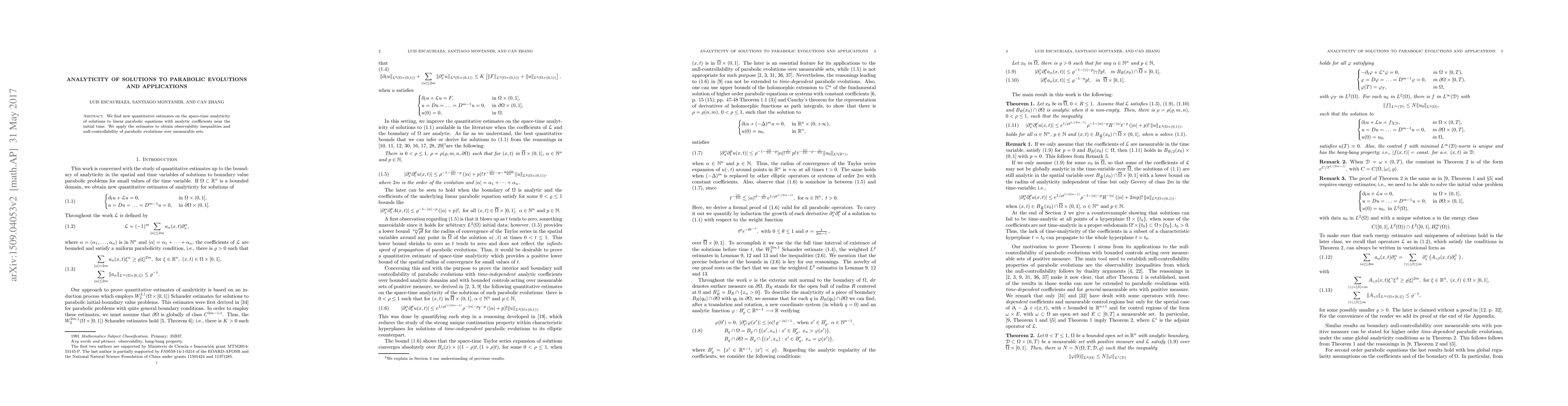 We find new quantitative estimates on the space-time analyticity of solutions to linear parabolic equations with analytic coefficients near the initial time. We apply the estimates to obtain observability inequalities and null-controllability of parabolic evolutions over measurable sets.