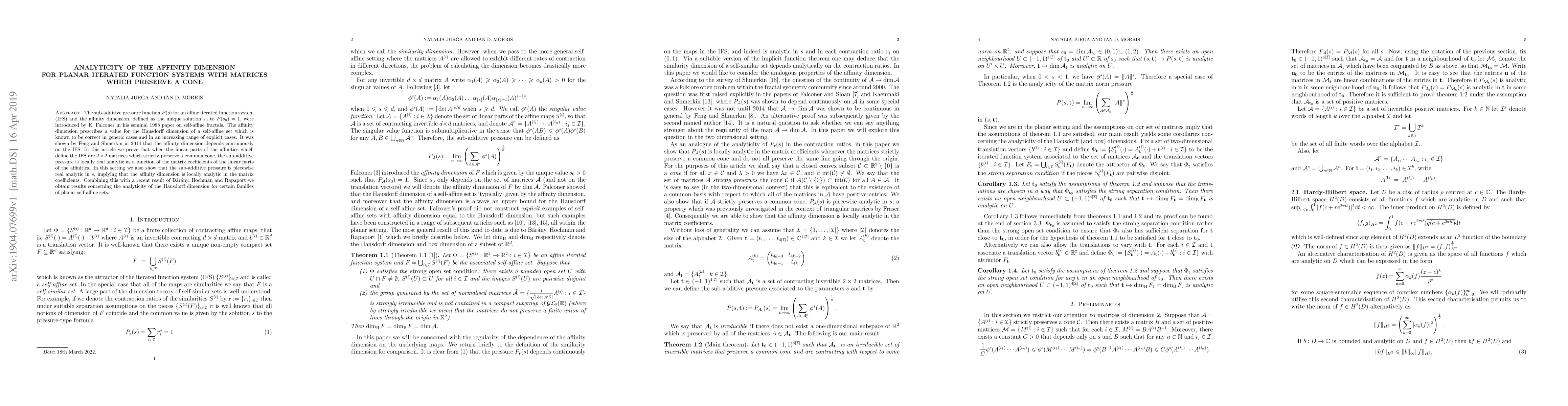 This paper proves that the sub-additive pressure function for planar iterated function systems with matrix components preserving a common cone is locally real analytic in the matrix coefficients. It also demonstrates that the affinity dimension, which determines the Hausdorff dimension for self-affine sets, is locally analytic in these coefficients.
