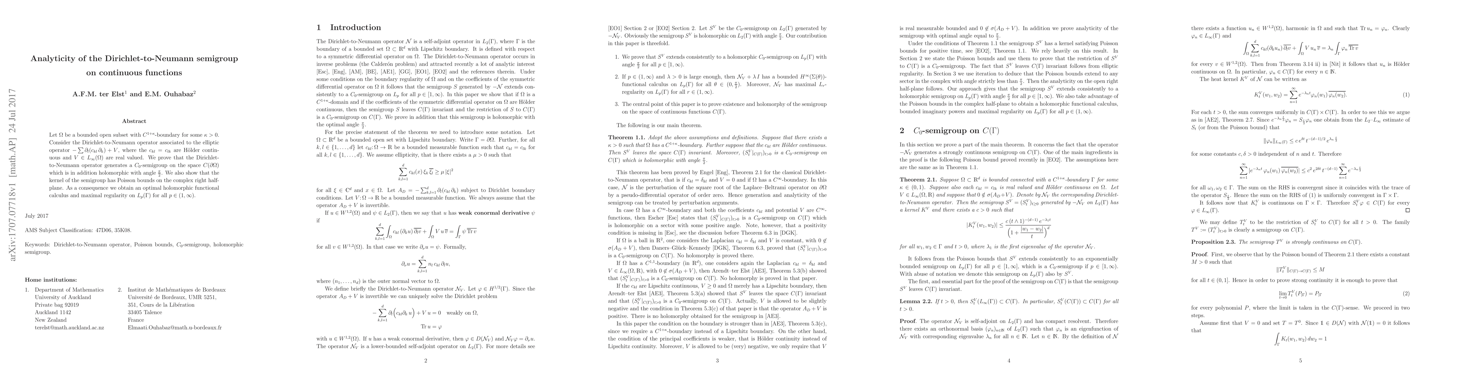 This paper proves the analyticity of the Dirichlet-to-Neumann semigroup associated with a specific elliptic operator on continuous boundary functions, demonstrating holomorphy with a specified angle and establishing Poisson bounds, leading to optimal functional calculus and maximal regularity in $L_p$ spaces.