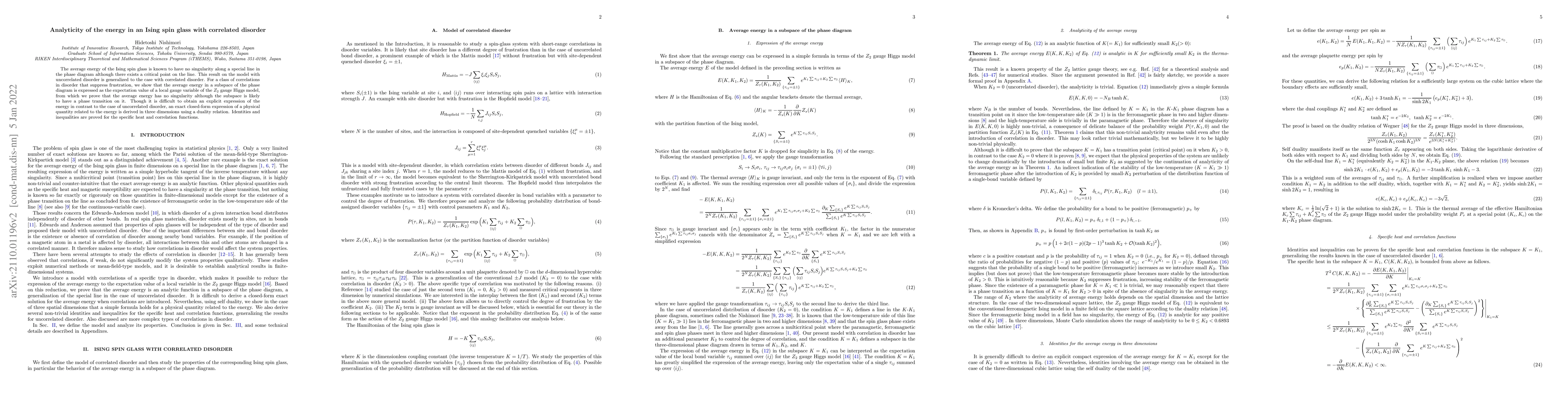 This paper generalizes the analyticity of the energy in an Ising spin glass model from uncorrelated to correlated disorder, showing no singularity in the average energy despite potential phase transitions. An exact closed-form expression for a related physical quantity is derived in three dimensions using a duality relation, along with identities and inequalities for specific heat and correlation functions.