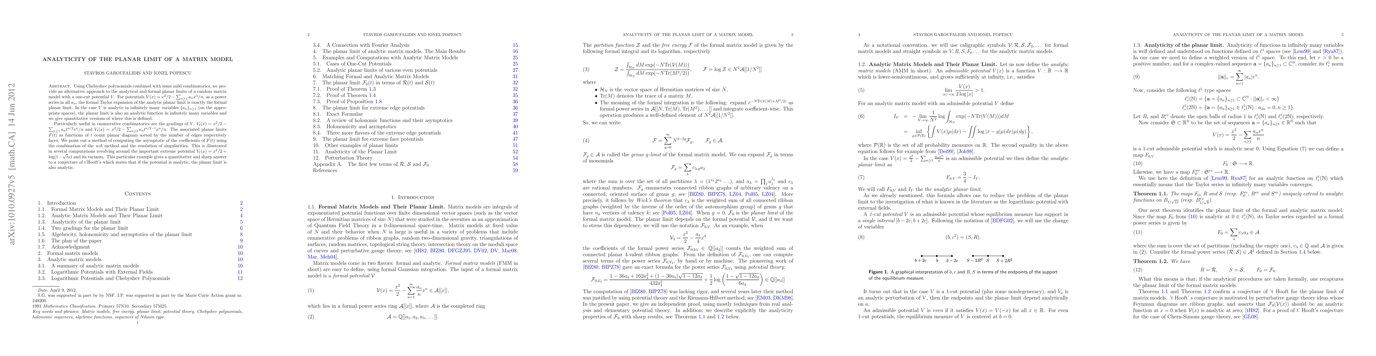 Using Chebyshev polynomials combined with some mild combinatorics, we provide a new formula for the analytical planar limit of a random matrix model with a one-cut potential $V$. For potentials $V(x)=x^{2}/2-\sum_{n\ge1}a_{n}x^{n}/n$, as a power series in all $a_{n}$, the formal Taylor expansion of the analytic planar limit is exactly the formal planar limit. In the case $V$ is analytic in infinitely many variables $\{a_{n}\}_{n\ge1}$ (on the appropriate spaces), the planar limit is also an analytic function in infinitely many variables and we give quantitative versions of where this is defined. Particularly useful in enumerative combinatorics are the gradings of $V$, $V_{t}(x)=x^{2}/2-\sum_{n\ge1}a_{n}t^{n/2}x^{n}/n$ and $V_{t}(x)=x^{2}/2-\sum_{n\ge3}a_{n}t^{n/2 -1}x^{n}/n$. The associated planar limits $F(t)$ as functions of $t$ count planar diagram sorted by the number of edges respectively faces. We point out a method of computing the asymptotic of the coefficients of $F(t)$ using the combination of the \emph{wzb} method and the resolution of singularies. This is illustrated in several computations revolving around the important extreme potential $V_{t}(x)=x^{2}/2+\log(1-\sqrt{t}x)$ and its variants. This particular example gives a quantitive and sharp answer to a conjecture of t'Hoofts which states that if the potential is analytic, the planar limit is also analytic.