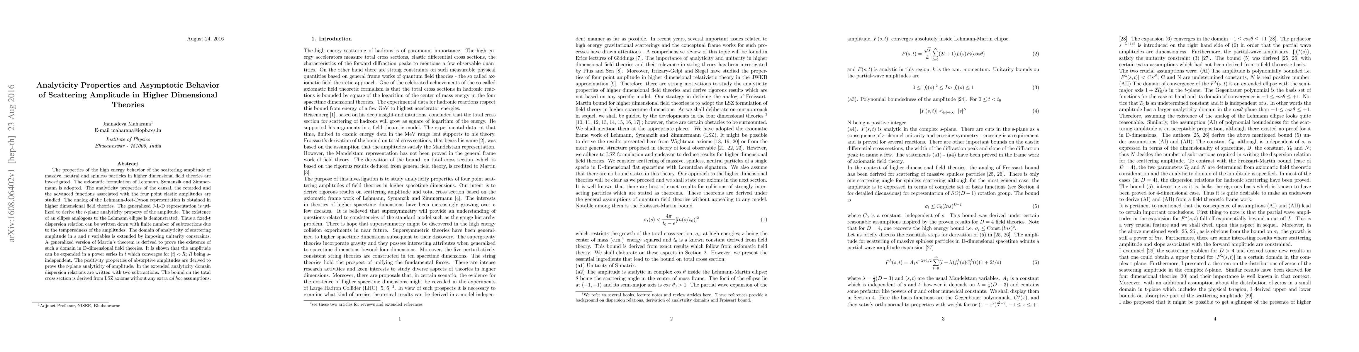 This paper investigates the high energy behavior and analyticity properties of scattering amplitudes for massive particles in higher dimensional field theories, deriving a generalized Lehmann-Jost-Dyson representation and establishing a fixed-t dispersion relation with finite subtractions. It also extends the domain of analyticity and derives a bound on the total cross section from LSZ axioms.