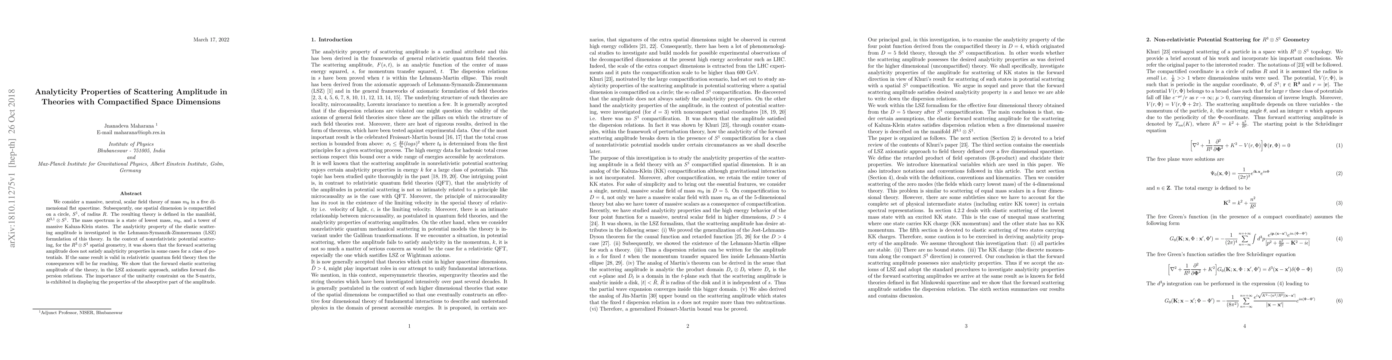 We consider a massive, neutral, scalar field theory of mass $m_0$ in a five dimensional flat spacetime. Subsequently, one spatial dimension is compactified on a circle, $S^1$, ofradius $R$. The resulting theory is defined in the manifold, $R^{3,1}\otimes S^1$. The mass spectrum is a state of lowest mass, $m_0$, and a tower of massive Kaluza-Klein states. The analyticity property of the elastic scattering amplitude is investigated in the Lehmann-Symanzik-Zimmermann (LSZ) formulation of this theory. In the context of nonrelativistic potential scattering, for the $R^3\otimes S^1$ spatial geometry, it was shown that the forward scattering amplitude does not satisfy analyticity properties in some cases for a class of potentials. If the same result is valid in relativistic quantum field theory then the consequences will be far reaching. We show that the forward elastic scattering amplitude of the theory, in the LSZ axiomatic approach, satisfies forward dispersion relations. The importance of the unitarity constraint on the S-matrix, is exhibited in displaying the properties of the absorptive part of the amplitude.