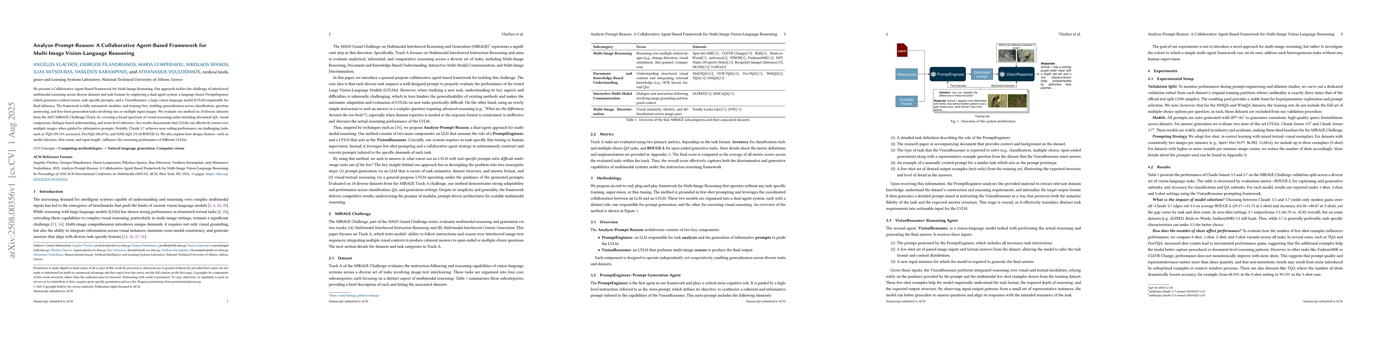 We present a Collaborative Agent-Based Framework for Multi-Image Reasoning. Our approach tackles the challenge of interleaved multimodal reasoning across diverse datasets and task formats by employing a dual-agent system: a language-based PromptEngineer, which generates context-aware, task-specific prompts, and a VisionReasoner, a large vision-language model (LVLM) responsible for final inference. The framework is fully automated, modular, and training-free, enabling generalization across classification, question answering, and free-form generation tasks involving one or multiple input images. We evaluate our method on 18 diverse datasets from the 2025 MIRAGE Challenge (Track A), covering a broad spectrum of visual reasoning tasks including document QA, visual comparison, dialogue-based understanding, and scene-level inference. Our results demonstrate that LVLMs can effectively reason over multiple images when guided by informative prompts. Notably, Claude 3.7 achieves near-ceiling performance on challenging tasks such as TQA (99.13% accuracy), DocVQA (96.87%), and MMCoQA (75.28 ROUGE-L). We also explore how design choices-such as model selection, shot count, and input length-influence the reasoning performance of different LVLMs.