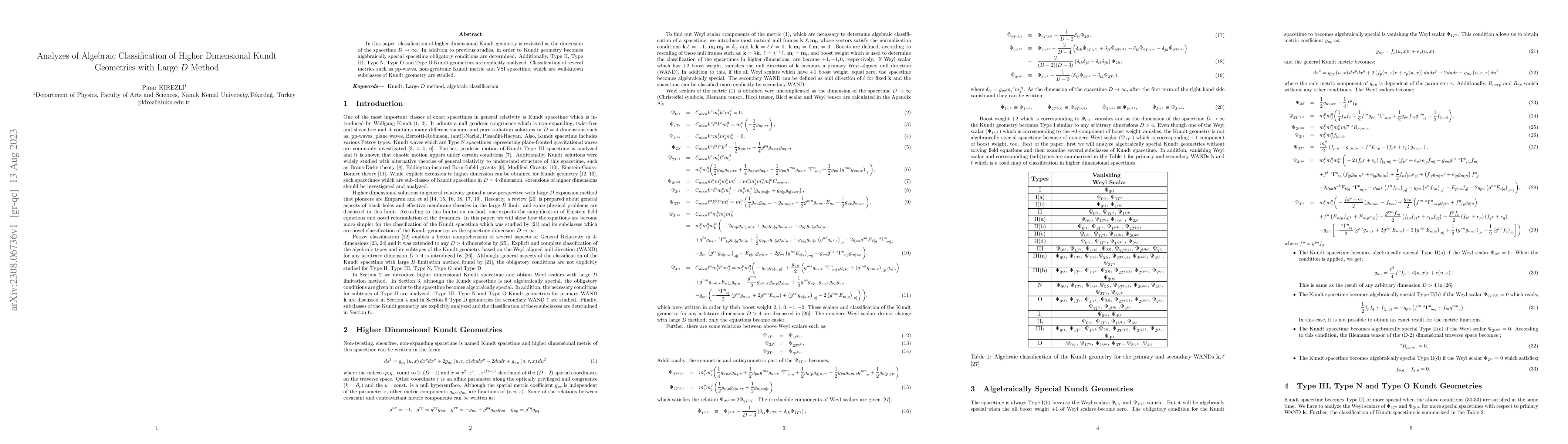 In this paper, classification of higher dimensional Kundt geometry is revisited as the dimension of the spacetime $D \rightarrow\infty$. In addition to previous studies, in order to Kundt geometry becomes algebraically special spacetime obligatory conditions are determined. Additionally, Type II, Type III, Type N, Type O and Type D Kundt geometries are explicitly analyzed. Classification of several metrics such as pp-waves, non-gyratonic Kundt metric and VSI spacetime, which are well-known subclasses of Kundt geometry are studied.