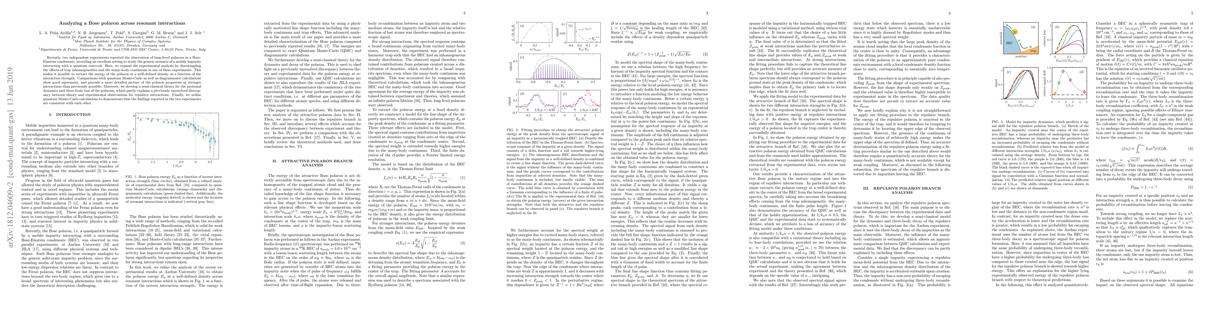 Recently, two independent experiments reported the observation of long-lived polarons in a Bose-Einstein condensate, providing an excellent setting to study the generic scenario of a mobile impurity interacting with a quantum reservoir. Here, we expand the experimental analysis by disentangling the effects of trap inhomogeneities and the many-body continuum in one of these experiments. This makes it possible to extract the energy of the polaron at a well-defined density as a function of the interaction strength. Comparisons with quantum Monte-Carlo as well as diagrammatic calculations show good agreement, and provide a more detailed picture of the polaron properties at stronger interactions than previously possible. Moreover, we develop a semi-classical theory for the motional dynamics and three-body loss of the polarons, which partly explains a previously unresolved discrepancy between theory and experimental observations for repulsive interactions. Finally, we utilize quantum Monte-Carlo calculations to demonstrate that the findings reported in the two experiments are consistent with each other.