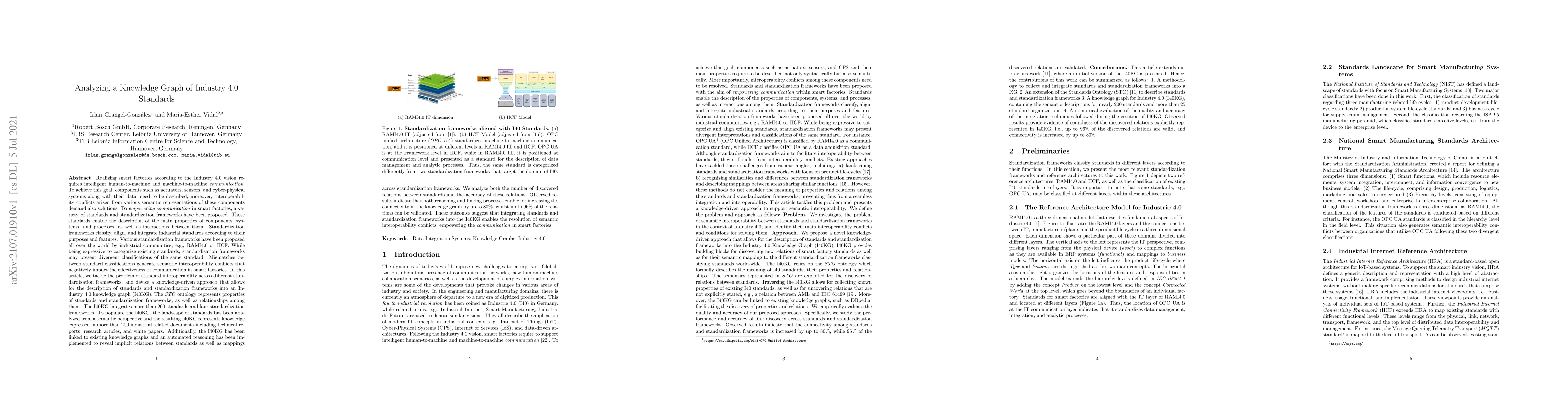 In this article, we tackle the problem of standard interoperability across different standardization frameworks, and devise a knowledge-driven approach that allows for the description of standards and standardization frameworks into an Industry 4.0 knowledge graph (I40KG). The STO ontology represents properties of standards and standardization frameworks, as well as relationships among them. The I40KG integrates more than 200 standards and four standardization frameworks. To populate the I40KG, the landscape of standards has been analyzed from a semantic perspective and the resulting I40KG represents knowledge expressed in more than 200 industrial related documents including technical reports, research articles, and white papers. Additionally, the I40KG has been linked to existing knowledge graphs and an automated reasoning has been implemented to reveal implicit relations between standards as well as mappings across standardization frameworks. We analyze both the number of discovered relations between standards and the accuracy of these relations. Observed results indicate that both reasoning and linking processes enable for increasing the connectivity in the knowledge graph by up to 80%, whilst up to 96% of the relations can be validated. These outcomes suggest that integrating standards and standardization frameworks into the I40KG enables the resolution of semantic interoperability conflicts, empowering the communication in smart factories.