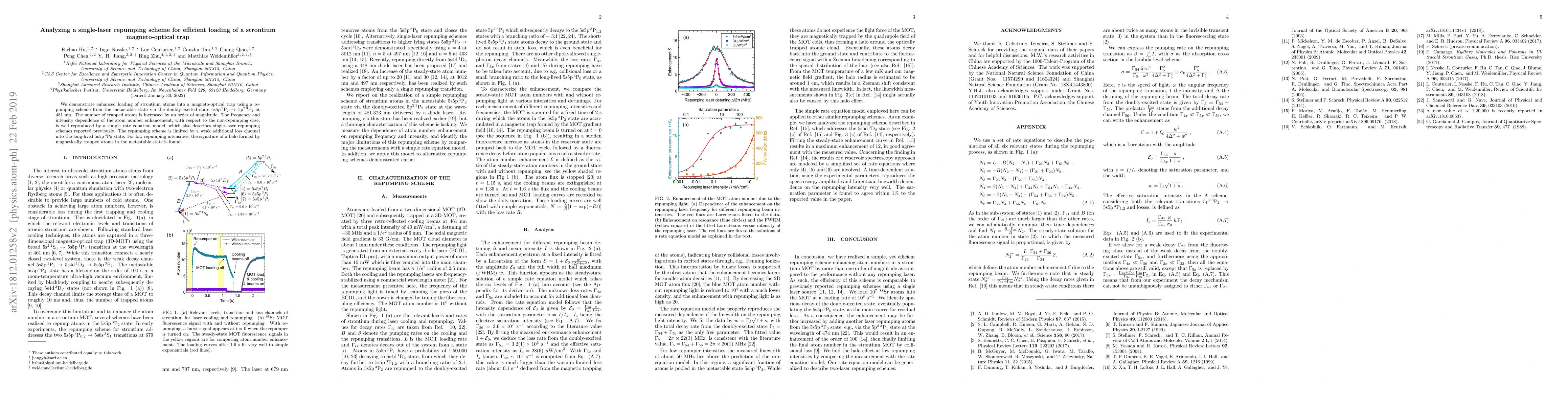 This paper demonstrates a single-laser repumping scheme that increases strontium atoms in a magneto-optical trap by an order of magnitude via a specific doubly-excited state transition at 481 nm. The scheme's effectiveness is modeled by a rate equation, though it is limited by an additional loss channel into a long-lived state.