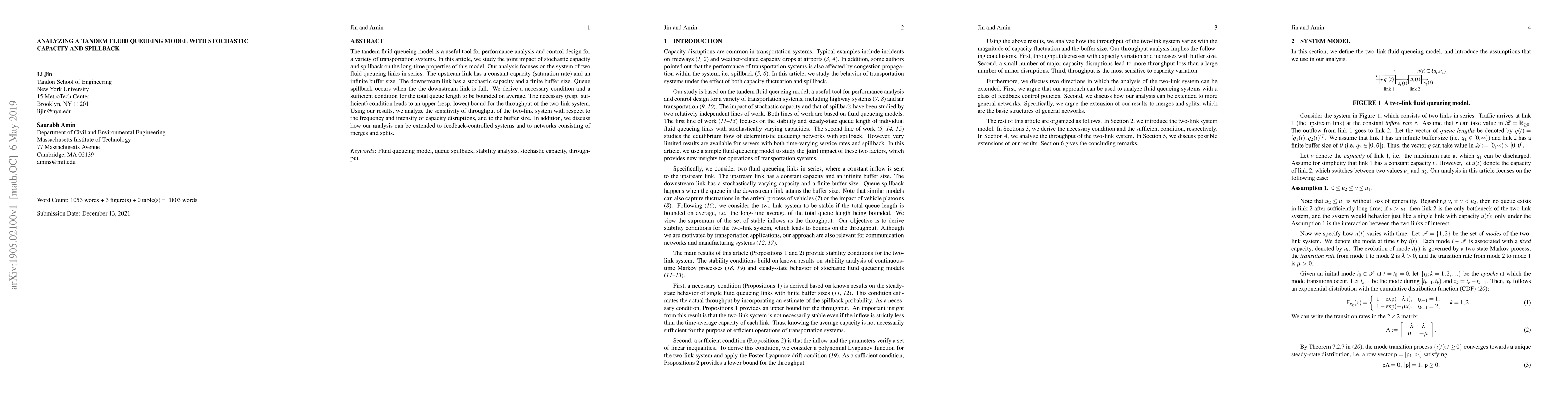 This paper analyzes a tandem fluid queueing model with stochastic capacity in the downstream link and spillback, deriving conditions for bounded average queue length and bounds on throughput. It also explores sensitivity to capacity disruptions and buffer size, and discusses extensions to feedback systems and networks.