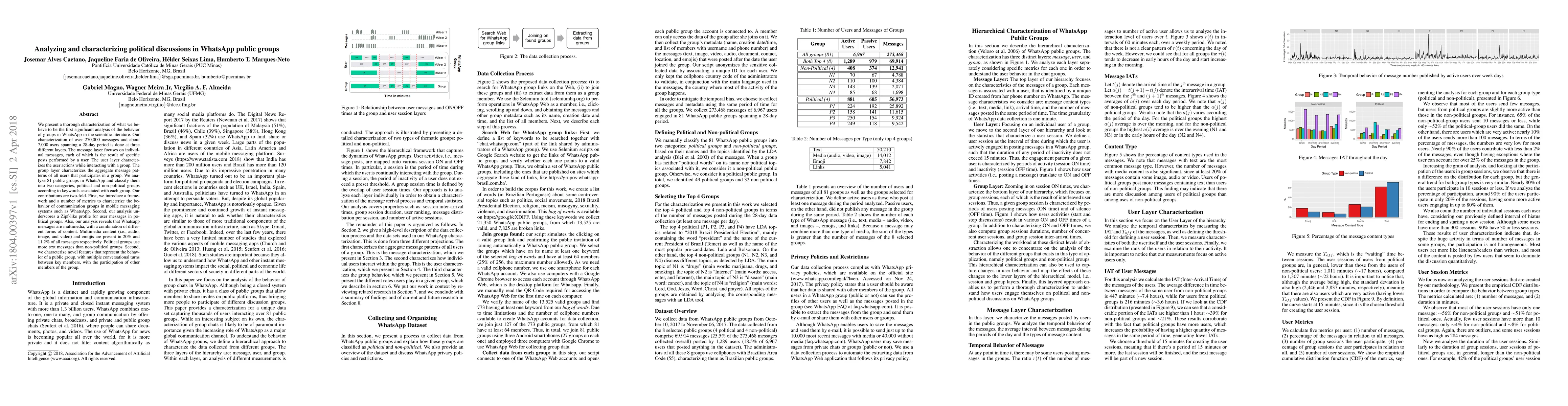 This study analyzes over 270,000 messages from 81 WhatsApp public groups over 28 days, categorizing them into political and non-political. It introduces a framework with metrics to characterize group communication behavior, revealing a Zipf-like profile for political groups and higher multimedia content usage.