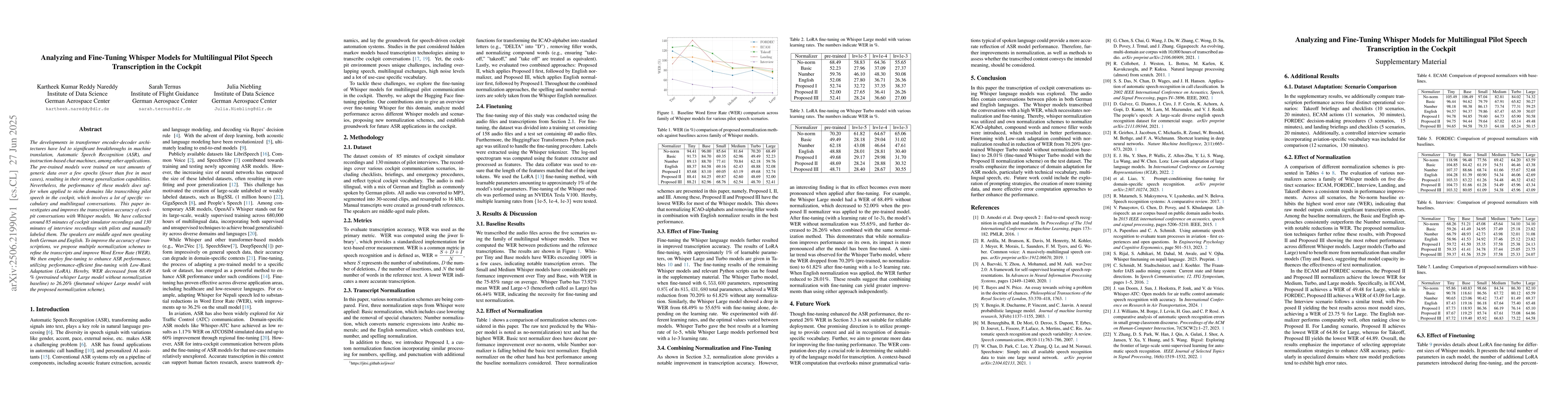 The developments in transformer encoder-decoder architectures have led to significant breakthroughs in machine translation, Automatic Speech Recognition (ASR), and instruction-based chat machines, among other applications. The pre-trained models were trained on vast amounts of generic data over a few epochs (fewer than five in most cases), resulting in their strong generalization capabilities. Nevertheless, the performance of these models does suffer when applied to niche domains like transcribing pilot speech in the cockpit, which involves a lot of specific vocabulary and multilingual conversations. This paper investigates and improves the transcription accuracy of cockpit conversations with Whisper models. We have collected around 85 minutes of cockpit simulator recordings and 130 minutes of interview recordings with pilots and manually labeled them. The speakers are middle aged men speaking both German and English. To improve the accuracy of transcriptions, we propose multiple normalization schemes to refine the transcripts and improve Word Error Rate (WER). We then employ fine-tuning to enhance ASR performance, utilizing performance-efficient fine-tuning with Low-Rank Adaptation (LoRA). Hereby, WER decreased from 68.49 \% (pretrained whisper Large model without normalization baseline) to 26.26\% (finetuned whisper Large model with the proposed normalization scheme).