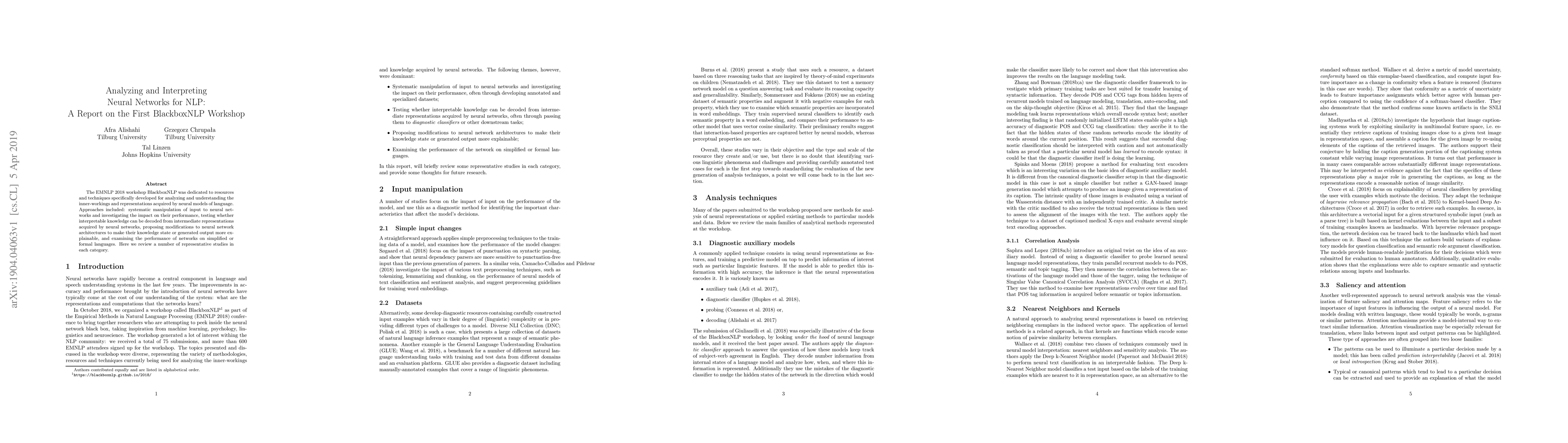 The EMNLP 2018 workshop BlackboxNLP was dedicated to resources and techniques specifically developed for analyzing and understanding the inner-workings and representations acquired by neural models of language. Approaches included: systematic manipulation of input to neural networks and investigating the impact on their performance, testing whether interpretable knowledge can be decoded from intermediate representations acquired by neural networks, proposing modifications to neural network architectures to make their knowledge state or generated output more explainable, and examining the performance of networks on simplified or formal languages. Here we review a number of representative studies in each category.