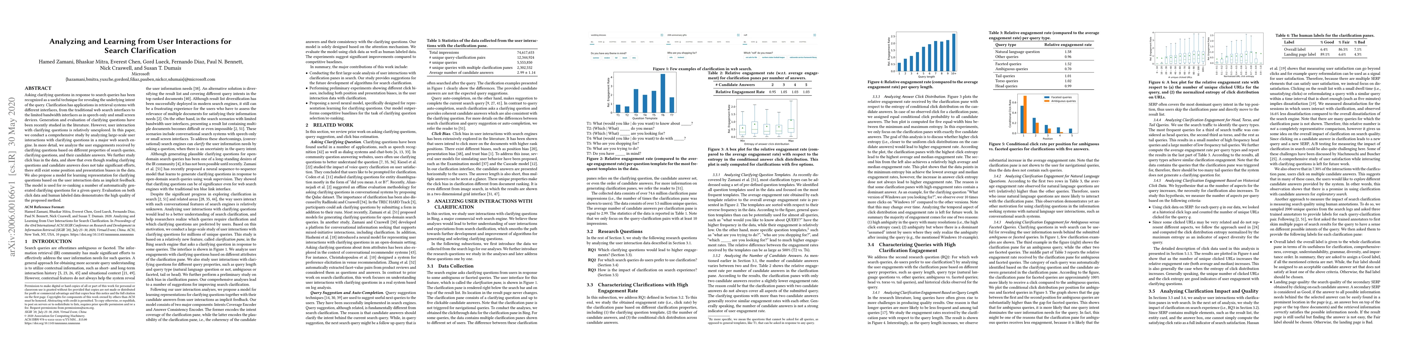 Researchers analyzed user interactions with clarifying questions in a web search engine to improve query understanding and re-ranking of generated queries. They found position and presentation biases and proposed an implicit feedback model for learning representation of clarifying questions.