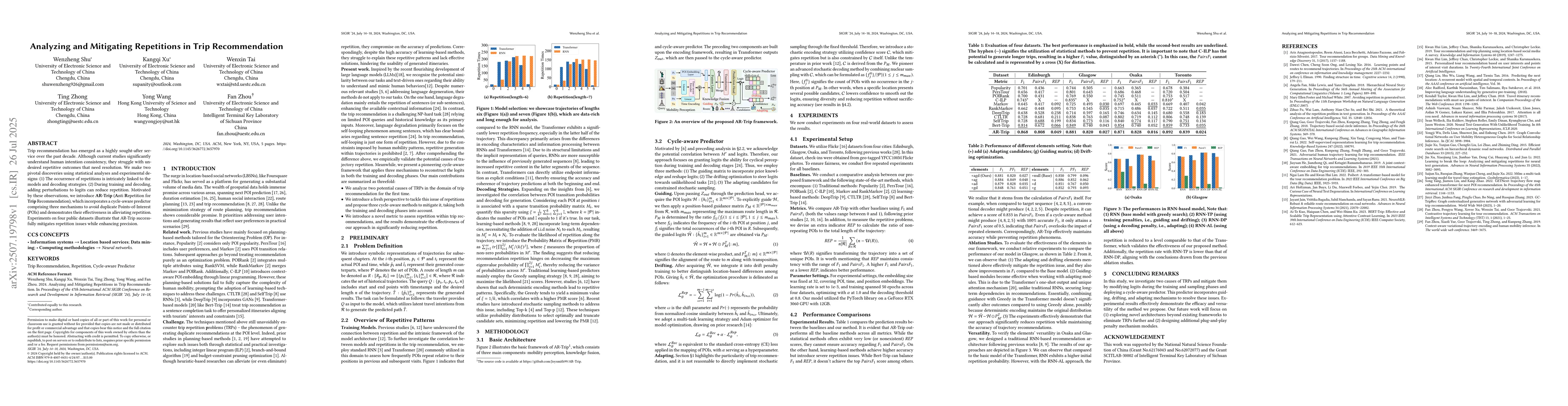 Trip recommendation has emerged as a highly sought-after service over the past decade. Although current studies significantly understand human intention consistency, they struggle with undesired repetitive outcomes that need resolution. We make two pivotal discoveries using statistical analyses and experimental designs: (1) The occurrence of repetitions is intricately linked to the models and decoding strategies. (2) During training and decoding, adding perturbations to logits can reduce repetition. Motivated by these observations, we introduce AR-Trip (Anti Repetition for Trip Recommendation), which incorporates a cycle-aware predictor comprising three mechanisms to avoid duplicate Points-of-Interest (POIs) and demonstrates their effectiveness in alleviating repetition. Experiments on four public datasets illustrate that AR-Trip successfully mitigates repetition issues while enhancing precision.