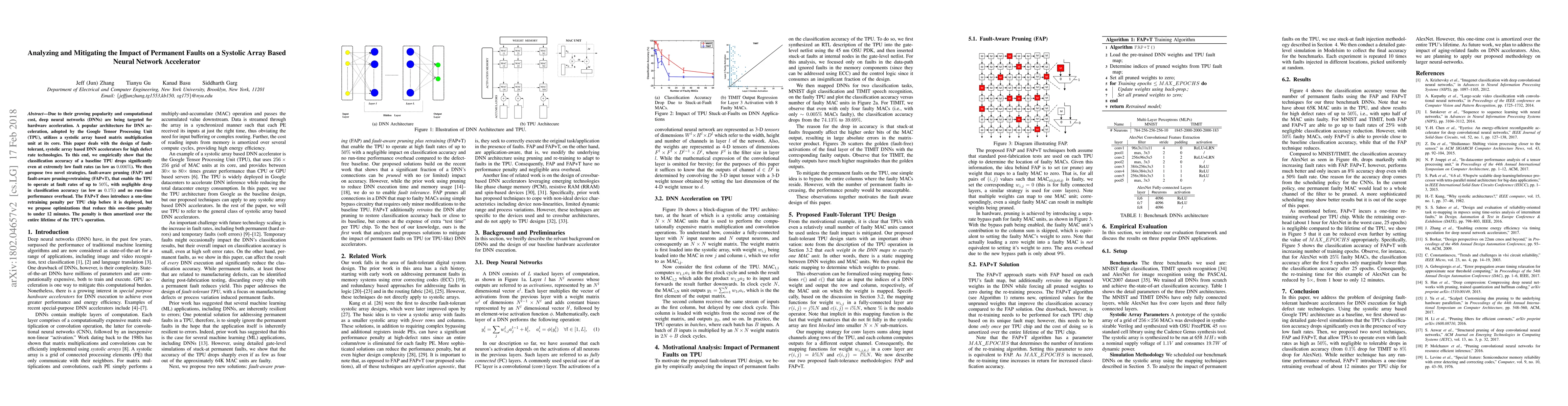 This paper investigates the impact of permanent faults on systolic array-based neural network accelerators, proposing fault-aware pruning and retraining strategies to maintain high classification accuracy even at high fault rates, with minimal performance overhead. The proposed methods enable operation at fault rates up to 50% with negligible accuracy loss.