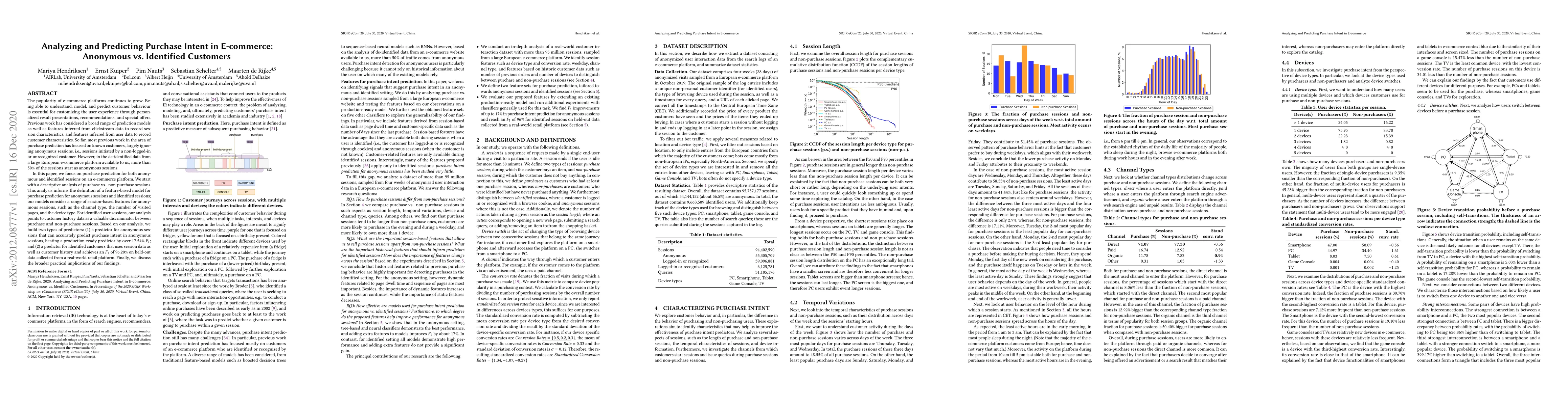 This paper investigates purchase intent prediction for both anonymous and identified customers on an e-commerce platform, finding that over 50% of sessions start anonymously. It develops two predictive models: one for anonymous sessions using session-based features and another for identified customers leveraging both session data and customer history, achieving significant improvements over existing predictors.