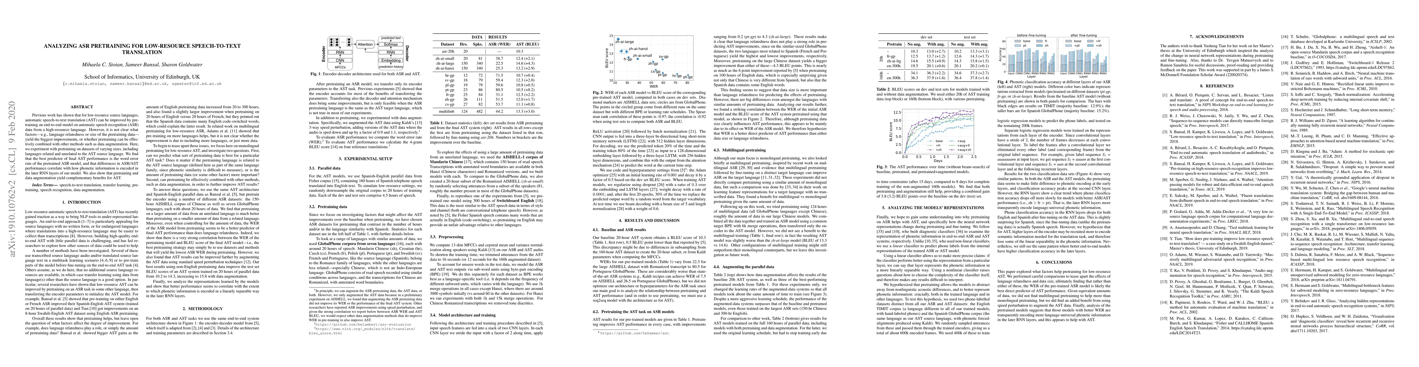 Previous work has shown that for low-resource source languages, automatic speech-to-text translation (AST) can be improved by pretraining an end-to-end model on automatic speech recognition (ASR) data from a high-resource language. However, it is not clear what factors --e.g., language relatedness or size of the pretraining data-- yield the biggest improvements, or whether pretraining can be effectively combined with other methods such as data augmentation. Here, we experiment with pretraining on datasets of varying sizes, including languages related and unrelated to the AST source language. We find that the best predictor of final AST performance is the word error rate of the pretrained ASR model, and that differences in ASR/AST performance correlate with how phonetic information is encoded in the later RNN layers of our model. We also show that pretraining and data augmentation yield complementary benefits for AST.