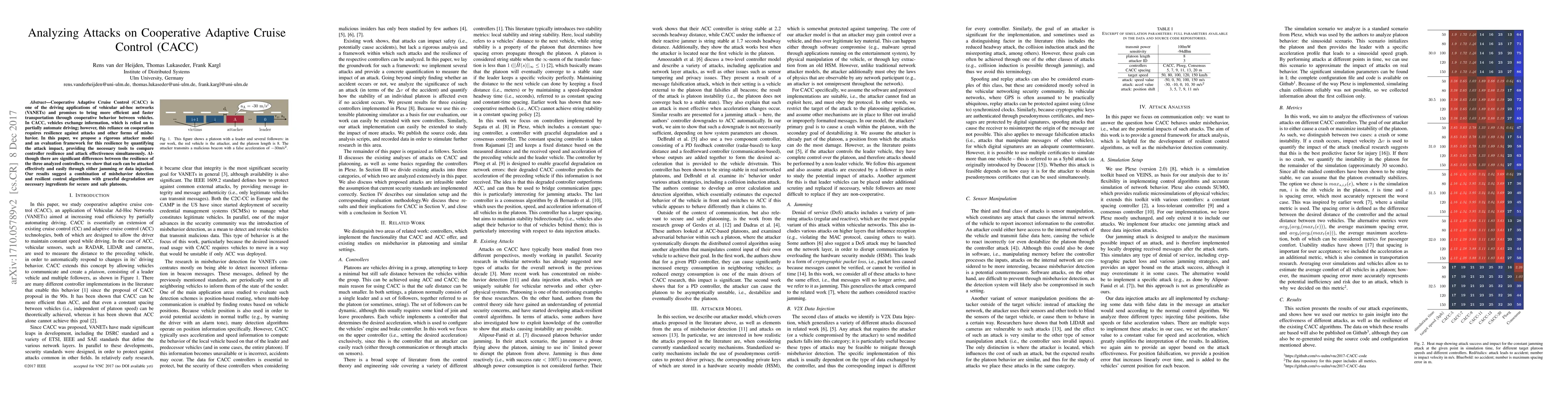 This paper proposes a rigorous attacker model and evaluation framework to assess the resilience of Cooperative Adaptive Cruise Control (CACC) systems against attacks. It demonstrates that while there are differences in resilience among various controllers, all are vulnerable to jamming or data injection, highlighting the need for misbehavior detection and resilient control algorithms for safe platooning.