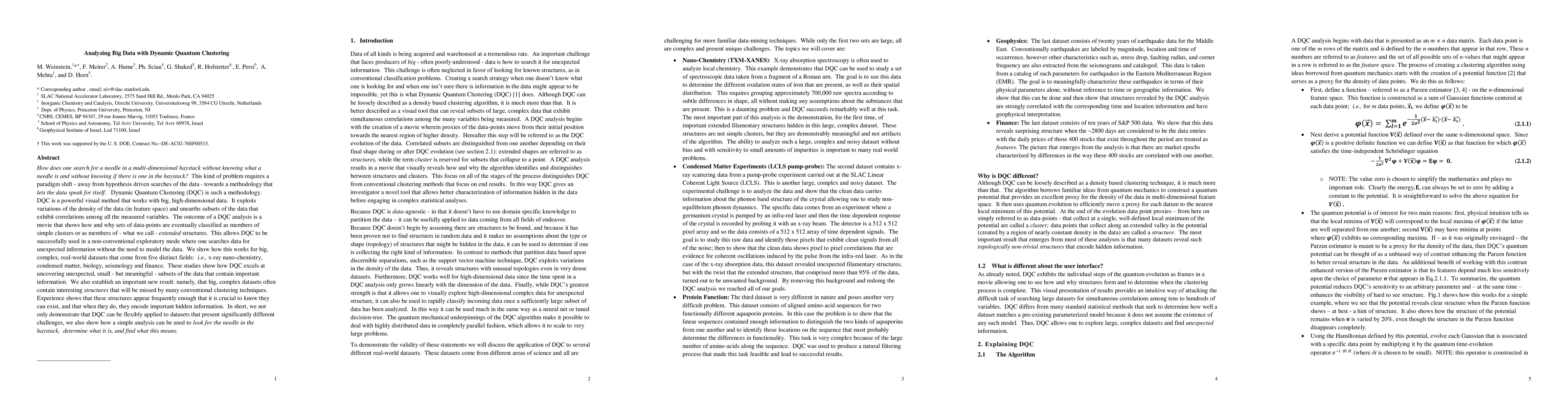 How does one search for a needle in a multi-dimensional haystack without knowing what a needle is and without knowing if there is one in the haystack? This kind of problem requires a paradigm shift - away from hypothesis driven searches of the data - towards a methodology that lets the data speak for itself. Dynamic Quantum Clustering (DQC) is such a methodology. DQC is a powerful visual method that works with big, high-dimensional data. It exploits variations of the density of the data (in feature space) and unearths subsets of the data that exhibit correlations among all the measured variables. The outcome of a DQC analysis is a movie that shows how and why sets of data-points are eventually classified as members of simple clusters or as members of - what we call - extended structures. This allows DQC to be successfully used in a non-conventional exploratory mode where one searches data for unexpected information without the need to model the data. We show how this works for big, complex, real-world datasets that come from five distinct fields: i.e., x-ray nano-chemistry, condensed matter, biology, seismology and finance. These studies show how DQC excels at uncovering unexpected, small - but meaningful - subsets of the data that contain important information. We also establish an important new result: namely, that big, complex datasets often contain interesting structures that will be missed by many conventional clustering techniques. Experience shows that these structures appear frequently enough that it is crucial to know they can exist, and that when they do, they encode important hidden information. In short, we not only demonstrate that DQC can be flexibly applied to datasets that present significantly different challenges, we also show how a simple analysis can be used to look for the needle in the haystack, determine what it is, and find what this means.