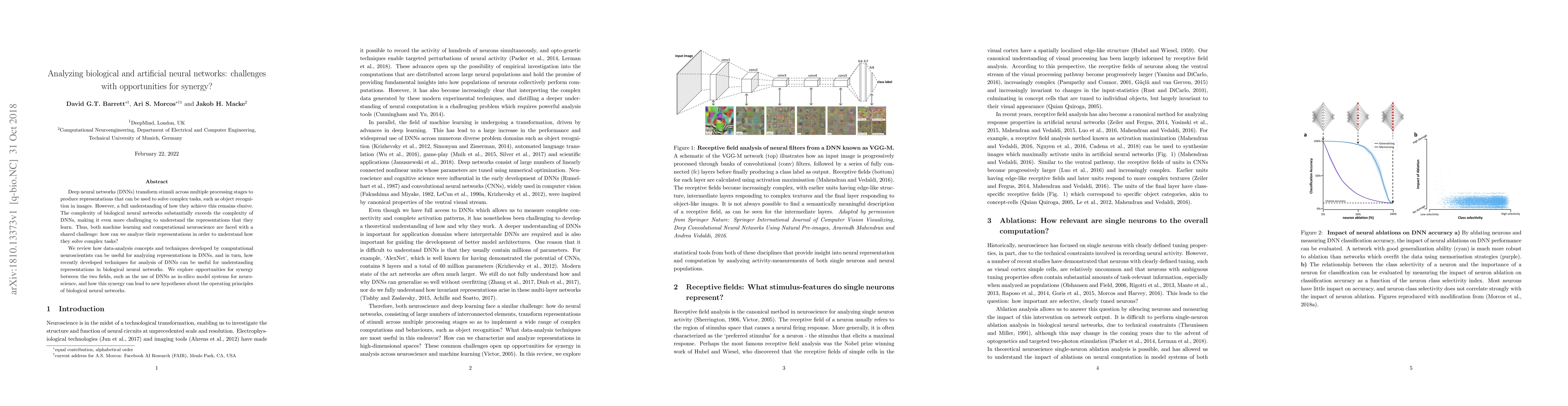 Deep neural networks (DNNs) transform stimuli across multiple processing stages to produce representations that can be used to solve complex tasks, such as object recognition in images. However, a full understanding of how they achieve this remains elusive. The complexity of biological neural networks substantially exceeds the complexity of DNNs, making it even more challenging to understand the representations that they learn. Thus, both machine learning and computational neuroscience are faced with a shared challenge: how can we analyze their representations in order to understand how they solve complex tasks? We review how data-analysis concepts and techniques developed by computational neuroscientists can be useful for analyzing representations in DNNs, and in turn, how recently developed techniques for analysis of DNNs can be useful for understanding representations in biological neural networks. We explore opportunities for synergy between the two fields, such as the use of DNNs as in-silico model systems for neuroscience, and how this synergy can lead to new hypotheses about the operating principles of biological neural networks.