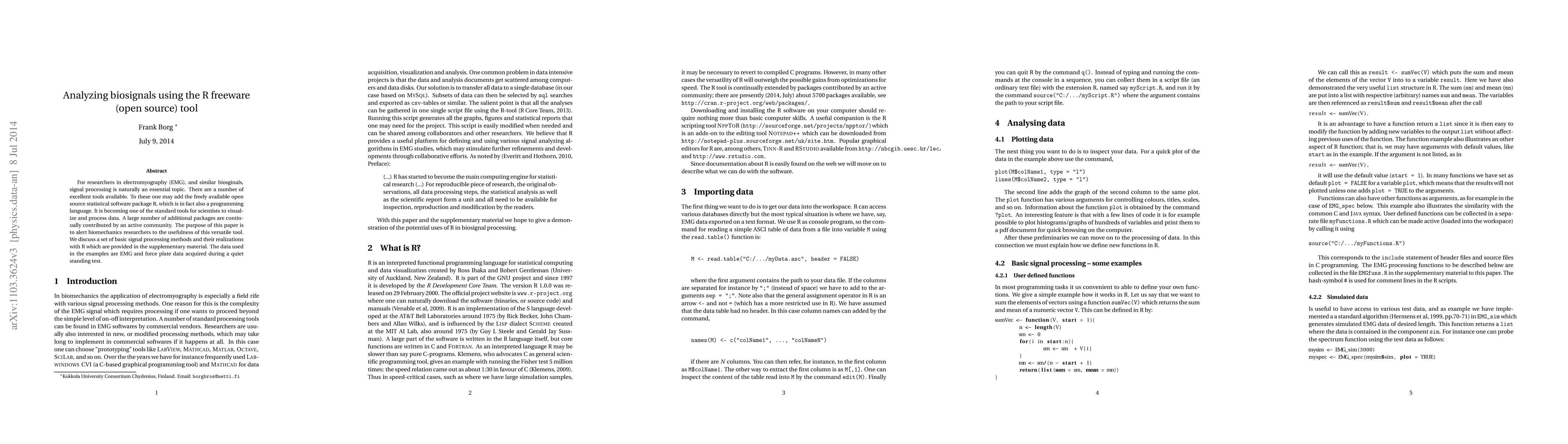 For researchers in electromyography (EMG), and similar biosginals, signal processing is naturally an essential topic. There are a number of excellent tools available. To these one may add the freely available open source statistical software package R, which is in fact also a programming language. It is becoming one the standard tools for scientists to visualize and process data. A large number of additional packages are continually contributed by an active community. The purpose of this paper is to alert biomechanics researchers to the usefulness of this versatile tool. We discuss a set of basic signal processing methods and their realizations with R which are provided in the supplementary material. The data used in the examples are EMG and force plate data acquired during a quiet standing test.