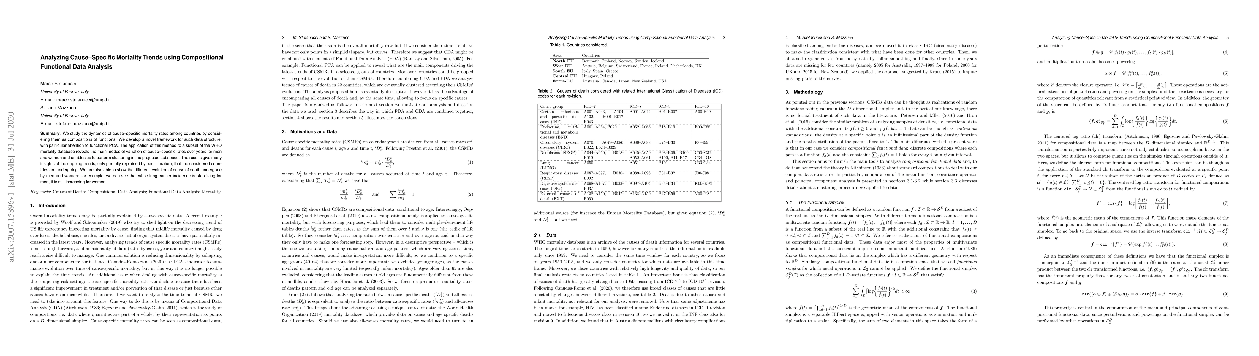 We study the dynamics of cause--specific mortality rates among countries by considering them as compositions of functions. We develop a novel framework for such data structure, with particular attention to functional PCA. The application of this method to a subset of the WHO mortality database reveals the main modes of variation of cause--specific rates over years for men and women and enables us to perform clustering in the projected subspace. The results give many insights of the ongoing trends, only partially explained by past literature, that the considered countries are undergoing. We are also able to show the different evolution of cause of death undergone by men and women: for example, we can see that while lung cancer incidence is stabilizing for men, it is still increasing for women.