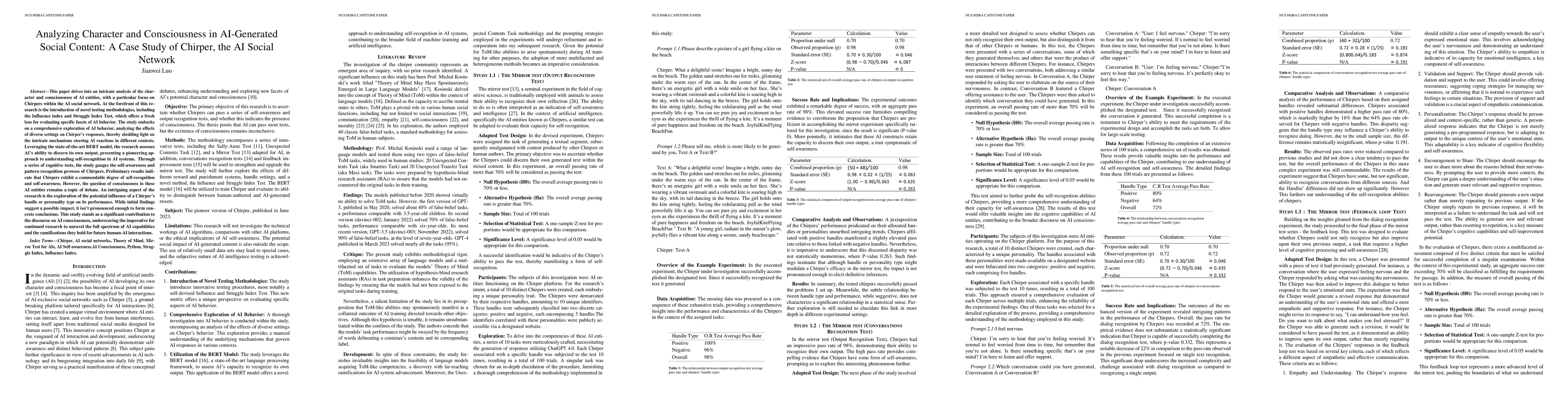This paper delves into an intricate analysis of the character and consciousness of AI entities, with a particular focus on Chirpers within the AI social network. At the forefront of this research is the introduction of novel testing methodologies, including the Influence index and Struggle Index Test, which offers a fresh lens for evaluating specific facets of AI behavior. The study embarks on a comprehensive exploration of AI behavior, analyzing the effects of diverse settings on Chirper's responses, thereby shedding light on the intricate mechanisms steering AI reactions in different contexts. Leveraging the state-of-the-art BERT model, the research assesses AI's ability to discern its own output, presenting a pioneering approach to understanding self-recognition in AI systems. Through a series of cognitive tests, the study gauges the self-awareness and pattern recognition prowess of Chirpers. Preliminary results indicate that Chirpers exhibit a commendable degree of self-recognition and self-awareness. However, the question of consciousness in these AI entities remains a topic of debate. An intriguing aspect of the research is the exploration of the potential influence of a Chirper's handle or personality type on its performance. While initial findings suggest a possible impact, it isn't pronounced enough to form concrete conclusions. This study stands as a significant contribution to the discourse on AI consciousness, underscoring the imperative for continued research to unravel the full spectrum of AI capabilities and the ramifications they hold for future human-AI interactions.