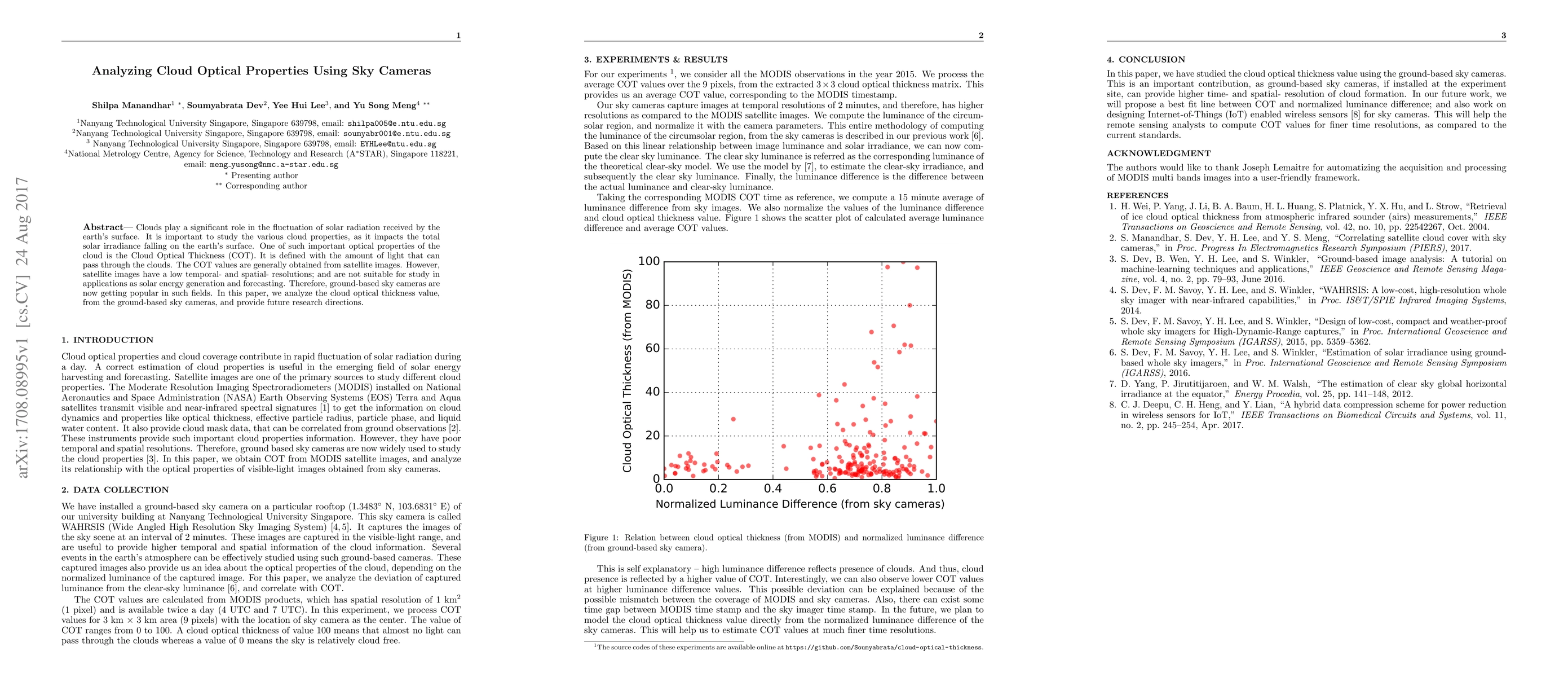 Clouds play a significant role in the fluctuation of solar radiation received by the earth's surface. It is important to study the various cloud properties, as it impacts the total solar irradiance falling on the earth's surface. One of such important optical properties of the cloud is the Cloud Optical Thickness (COT). It is defined with the amount of light that can pass through the clouds. The COT values are generally obtained from satellite images. However, satellite images have a low temporal- and spatial- resolutions; and are not suitable for study in applications as solar energy generation and forecasting. Therefore, ground-based sky cameras are now getting popular in such fields. In this paper, we analyze the cloud optical thickness value, from the ground-based sky cameras, and provide future research directions.