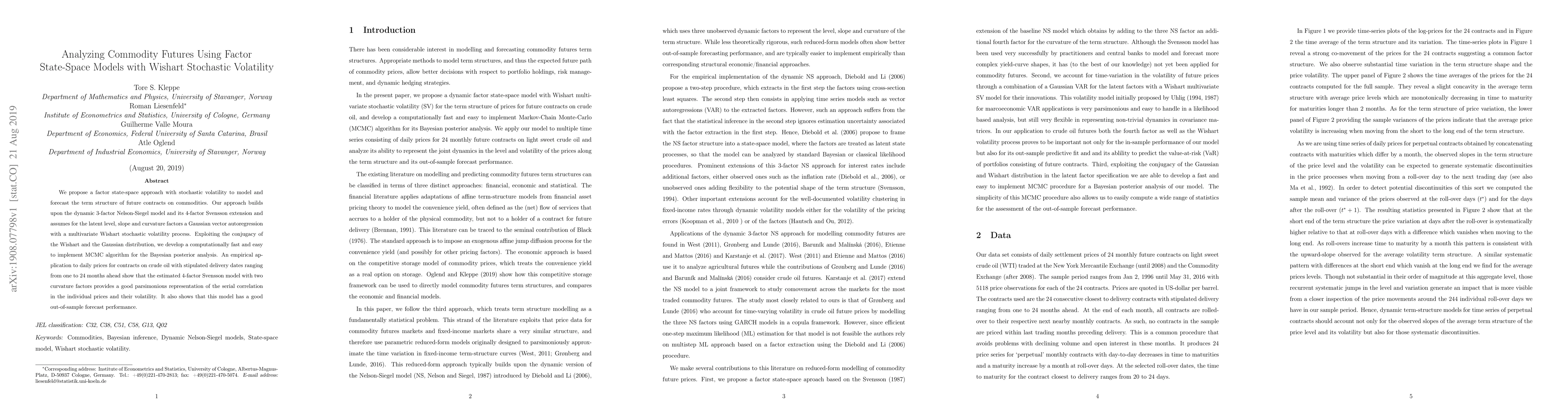 This paper proposes a factor state-space model with stochastic volatility to model and forecast commodity futures. The model uses a 4-factor Svensson extension with a Wishart stochastic volatility process, and demonstrates good parsimony and out-of-sample forecasting performance using crude oil futures data.