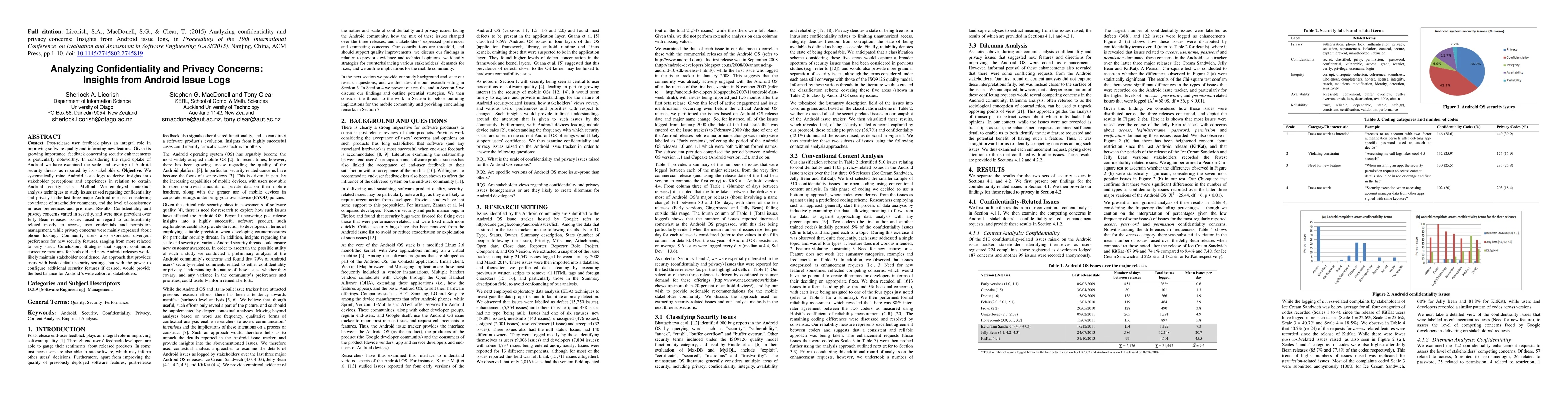 A study analyzed Android issue logs to understand stakeholder concerns over confidentiality and privacy, finding that these issues varied in severity and priority across different releases. Recommendations include providing default security settings with customization options for users.