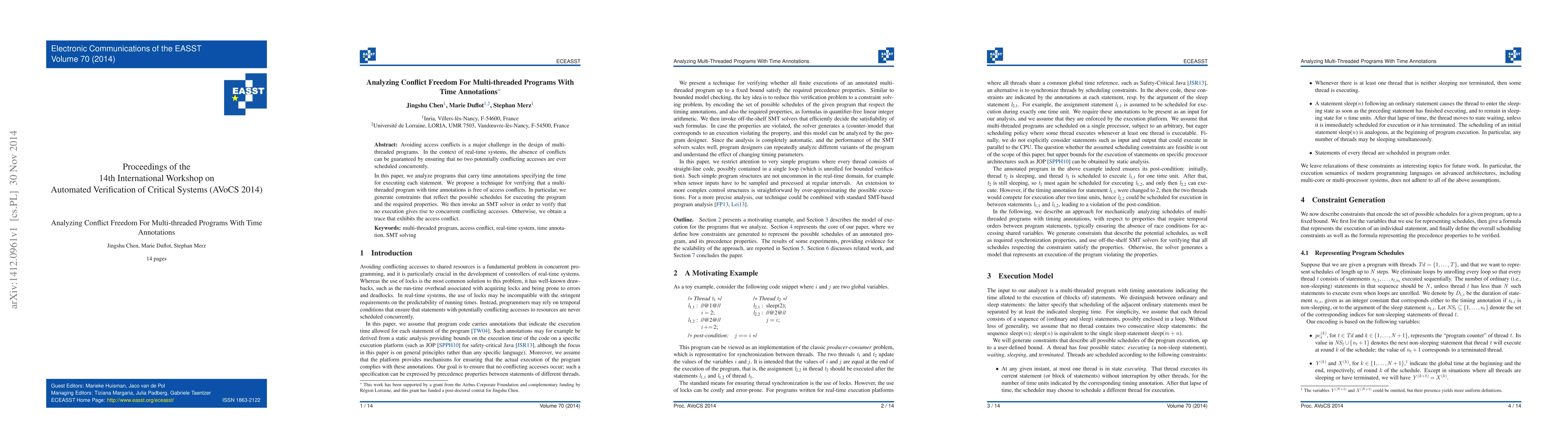 This paper proposes a technique to verify multi-threaded programs with time annotations for conflict freedom by generating execution constraints and using an SMT solver to check for concurrent conflicting accesses, providing a trace if conflicts are detected.