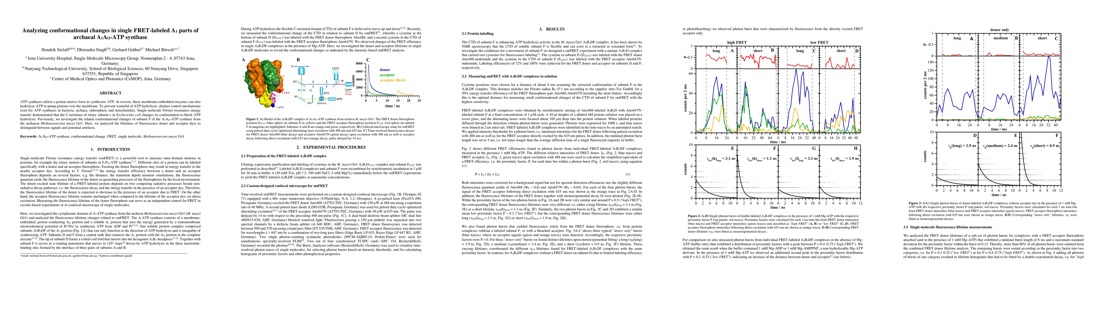 This paper investigates conformational changes in the archaeal A1AO-ATP synthase using single-molecule FRET, focusing on the A1 parts. It aims to differentiate between genuine conformational changes and potential artifacts by analyzing the lifetimes of fluorescence dyes.