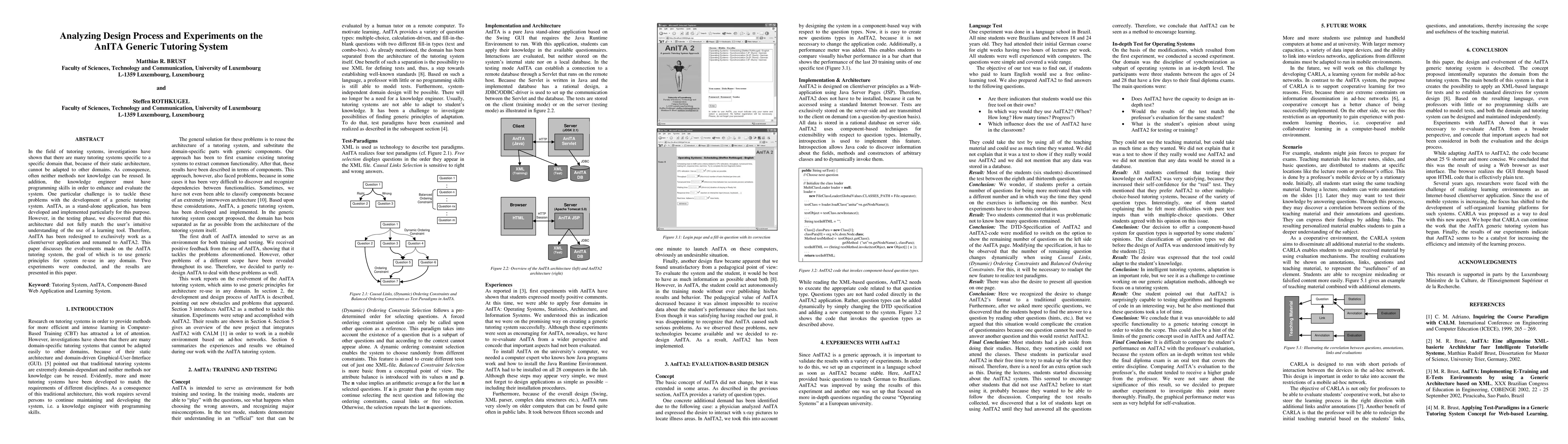 In the field of tutoring systems, investigations have shown that there are many tutoring systems specific to a specific domain that, because of their static architecture, cannot be adapted to other domains. As consequence, often neither methods nor knowledge can be reused. In addition, the knowledge engineer must have programming skills in order to enhance and evaluate the system. One particular challenge is to tackle these problems with the development of a generic tutoring system. AnITA, as a stand-alone application, has been developed and implemented particularly for this purpose. However, in the testing phase, we discovered that this architecture did not fully match the user's intuitive understanding of the use of a learning tool. Therefore, AnITA has been redesigned to exclusively work as a client/server application and renamed to AnITA2. This paper discusses the evolvements made on the AnITA tutoring system, the goal of which is to use generic principles for system re-use in any domain. Two experiments were conducted, and the results are presented in this paper.
