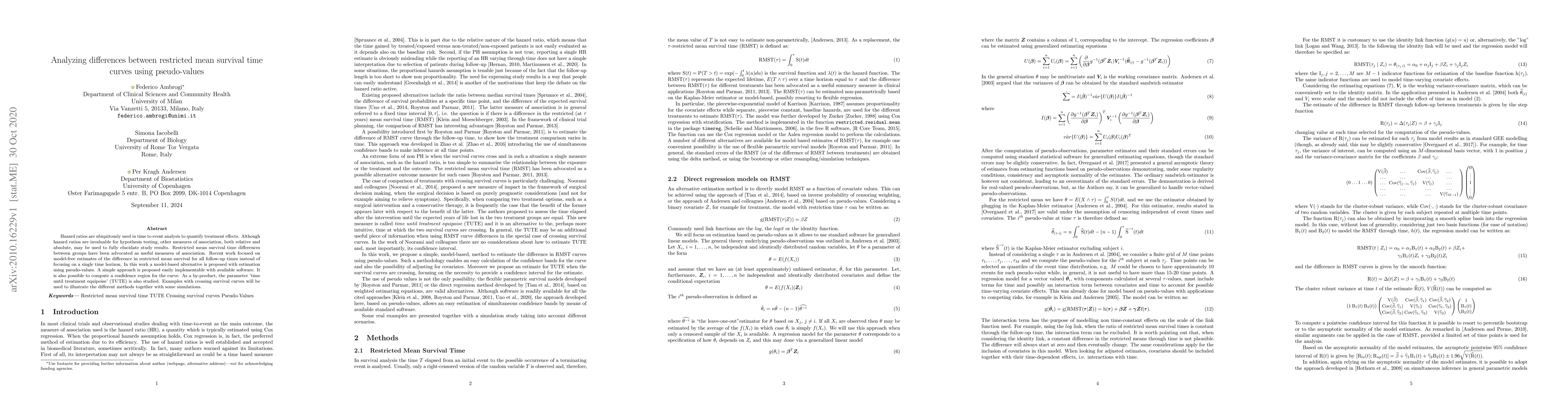 This paper proposes a model-based alternative to estimate differences in restricted mean survival time using pseudo-values, offering a more flexible approach than traditional hazard ratios. It also introduces a confidence region for the survival curve and explores the concept of 'time until treatment equipoise' (TUTE).