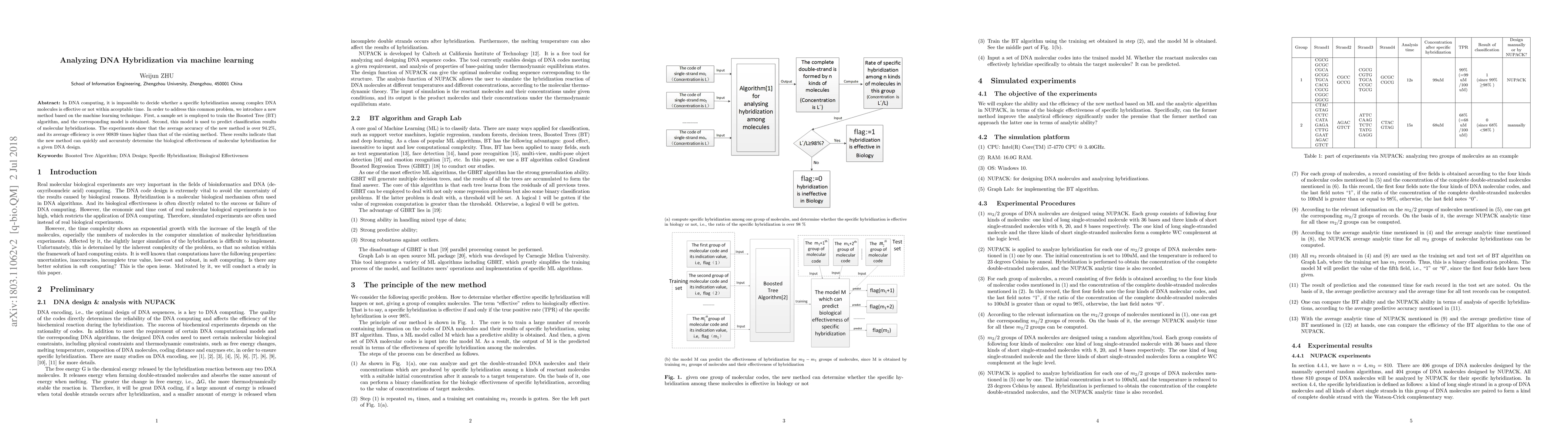 This paper proposes a machine learning-based method using Boosted Tree (BT) algorithm to predict DNA hybridization effectiveness, achieving over 94.2% accuracy and significantly improving efficiency by more than 90,839 times compared to existing methods.