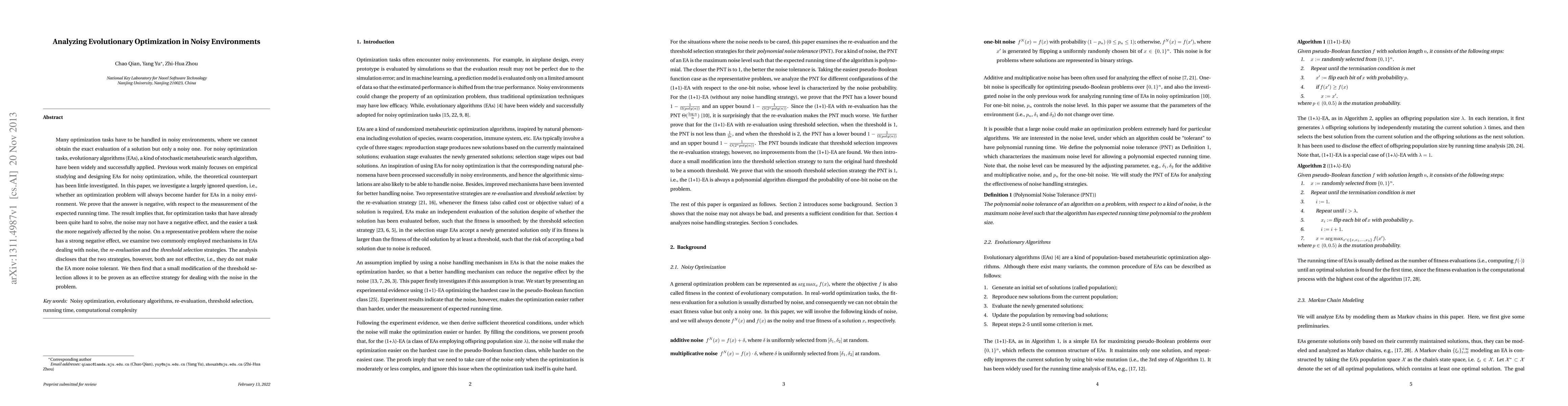 Researchers investigate how noisy environments affect evolutionary optimization algorithms, finding that noise does not always increase difficulty for these methods and identifying an effective strategy to mitigate its impact.