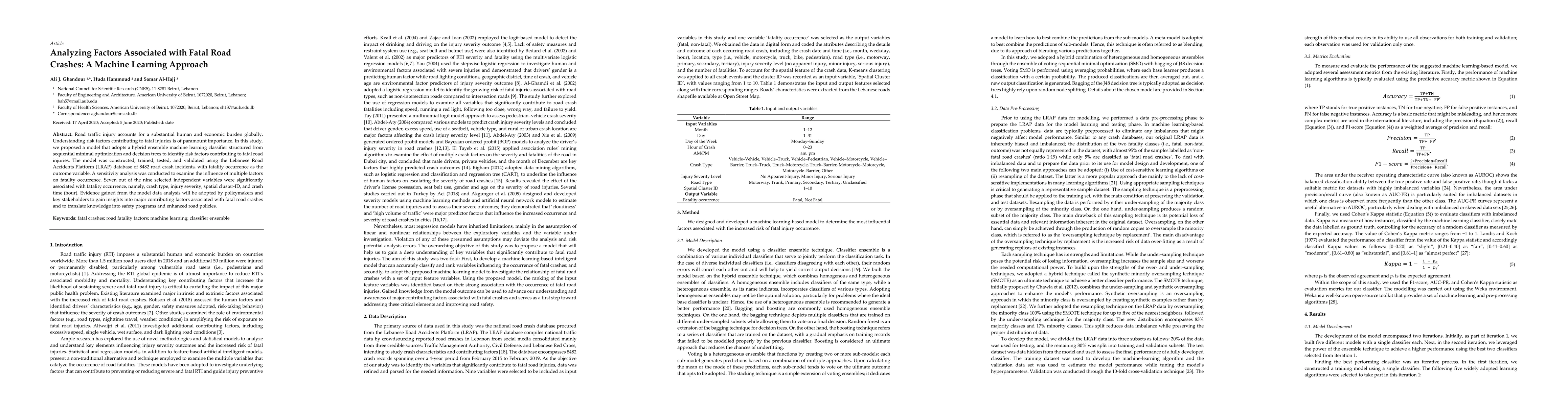 Road traffic injury accounts for a substantial human and economic burden globally. Understanding risk factors contributing to fatal injuries is of paramount importance. In this study, we proposed a model that adopts a hybrid ensemble machine learning classifier structured from sequential minimal optimization and decision trees to identify risk factors contributing to fatal road injuries. The model was constructed, trained, tested, and validated using the Lebanese Road Accidents Platform (LRAP) database of 8482 road crash incidents, with fatality occurrence as the outcome variable. A sensitivity analysis was conducted to examine the influence of multiple factors on fatality occurrence. Seven out of the nine selected independent variables were significantly associated with fatality occurrence, namely, crash type, injury severity, spatial cluster-ID, and crash time (hour). Evidence gained from the model data analysis will be adopted by policymakers and key stakeholders to gain insights into major contributing factors associated with fatal road crashes and to translate knowledge into safety programs and enhanced road policies.