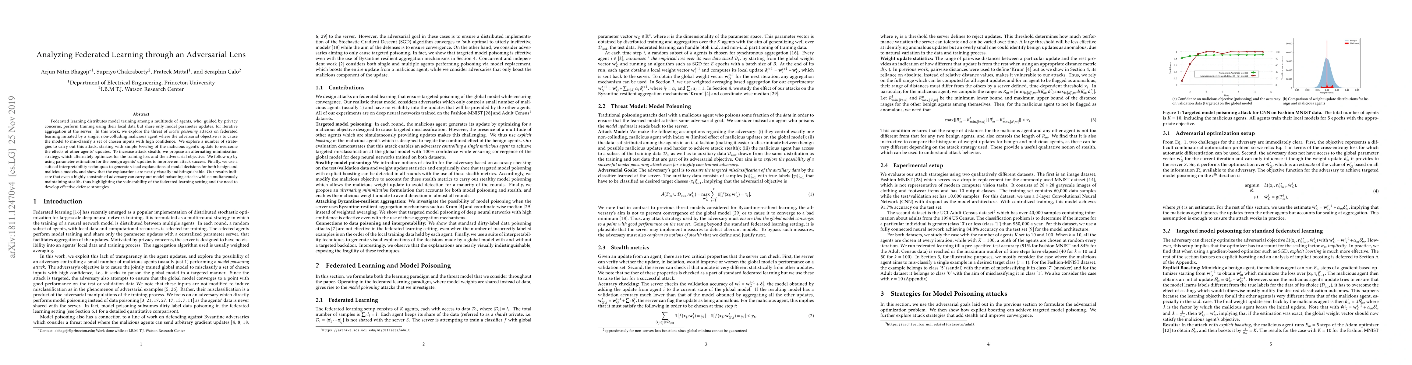 Federated learning distributes model training among a multitude of agents, who, guided by privacy concerns, perform training using their local data but share only model parameter updates, for iterative aggregation at the server. In this work, we explore the threat of model poisoning attacks on federated learning initiated by a single, non-colluding malicious agent where the adversarial objective is to cause the model to misclassify a set of chosen inputs with high confidence. We explore a number of strategies to carry out this attack, starting with simple boosting of the malicious agent's update to overcome the effects of other agents' updates. To increase attack stealth, we propose an alternating minimization strategy, which alternately optimizes for the training loss and the adversarial objective. We follow up by using parameter estimation for the benign agents' updates to improve on attack success. Finally, we use a suite of interpretability techniques to generate visual explanations of model decisions for both benign and malicious models and show that the explanations are nearly visually indistinguishable. Our results indicate that even a highly constrained adversary can carry out model poisoning attacks while simultaneously maintaining stealth, thus highlighting the vulnerability of the federated learning setting and the need to develop effective defense strategies.
