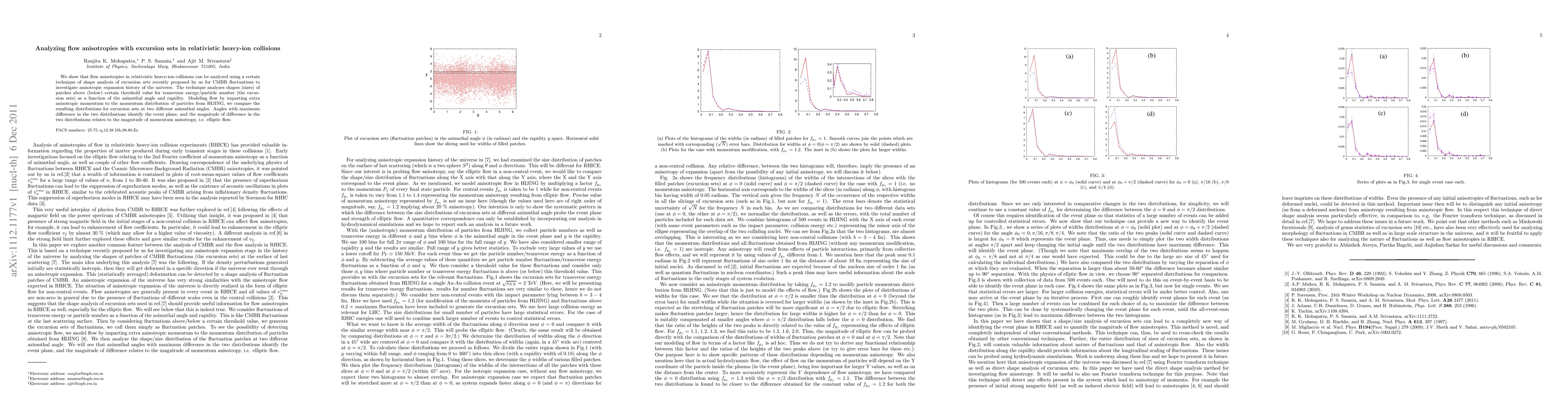 We show that flow anisotropies in relativistic heavy-ion collisions can be analyzed using a certain technique of shape analysis of excursion sets recently proposed by us for CMBR fluctuations to investigate anisotropic expansion history of the universe. The technique analyzes shapes (sizes) of patches above (below) certain threshold value for transverse energy/particle number (the excursion sets) as a function of the azimuthal angle and rapidity. Modeling flow by imparting extra anisotropic momentum to the momentum distribution of particles from HIJING, we compare the resulting distributions for excursion sets at two different azimuthal angles. Angles with maximum difference in the two distributions identify the event plane, and the magnitude of difference in the two distributions relates to the magnitude of momentum anisotropy, i.e. elliptic flow.