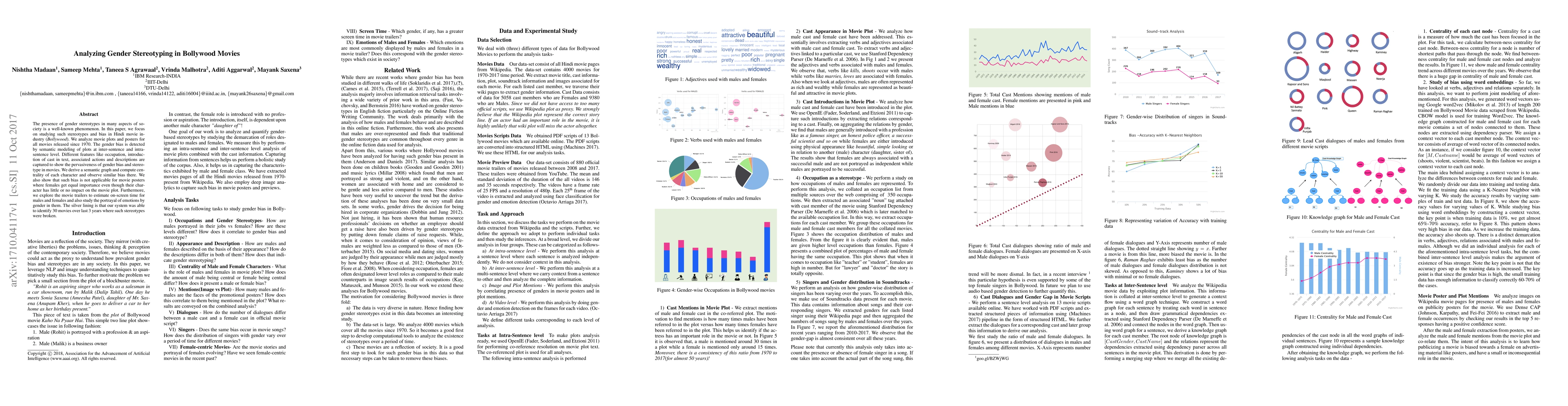 The study analyzes Bollywood movies' plots and posters for gender stereotypes from 1970 to 2017 using semantic modeling at inter-sentence and intra-sentence levels. It captures features like occupation, cast introduction, associated actions, and descriptions to show the pervasiveness of gender bias. The research also examines movie trailers for on-screen time and emotion portrayal by gender.