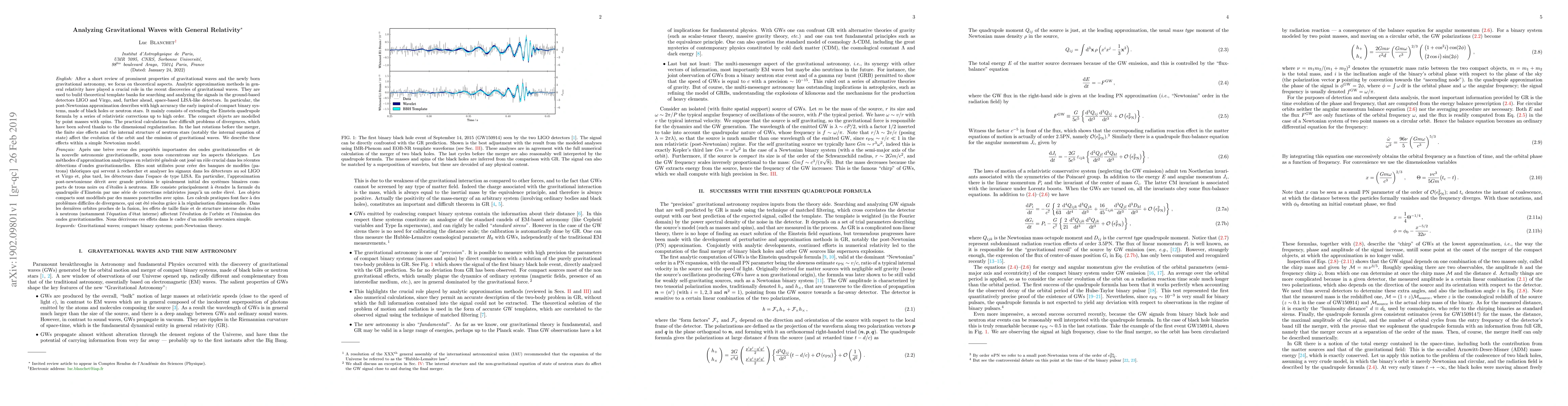 After a short review of prominent properties of gravitational waves and the newly born gravitational astronomy, we focus on theoretical aspects. Analytic approximation methods in general relativity have played a crucial role in the recent discoveries of gravitational waves. They are used to build theoretical template banks for searching and analyzing the signals in the ground-based detectors LIGO and Virgo, and, further ahead, space-based LISA-like detectors. In particular, the post-Newtonian approximation describes with high accuracy the early inspiral of compact binary systems, made of black holes or neutron stars. It mainly consists of extending the Einstein quadrupole formula by a series of relativistic corrections up to high order. The compact objects are modelled by point masses with spins. The practical calculations face difficult problems of divergences, which have been solved thanks to the dimensional regularization. In the last rotations before the merger, the finite size effects and the internal structure of neutron stars (notably the internal equation of state) affect the evolution of the orbit and the emission of gravitational waves. We describe these effects within a simple Newtonian model.