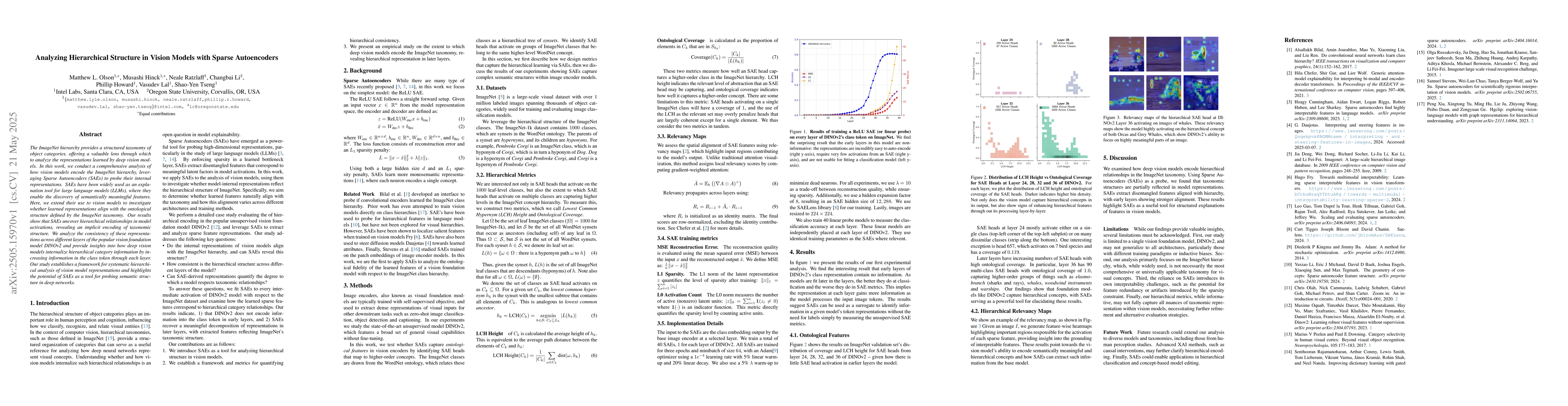 This research establishes a framework for systematic hierarchical analysis of vision model representations, highlighting the potential of SAEs as a tool for probing semantic structure in deep networks.