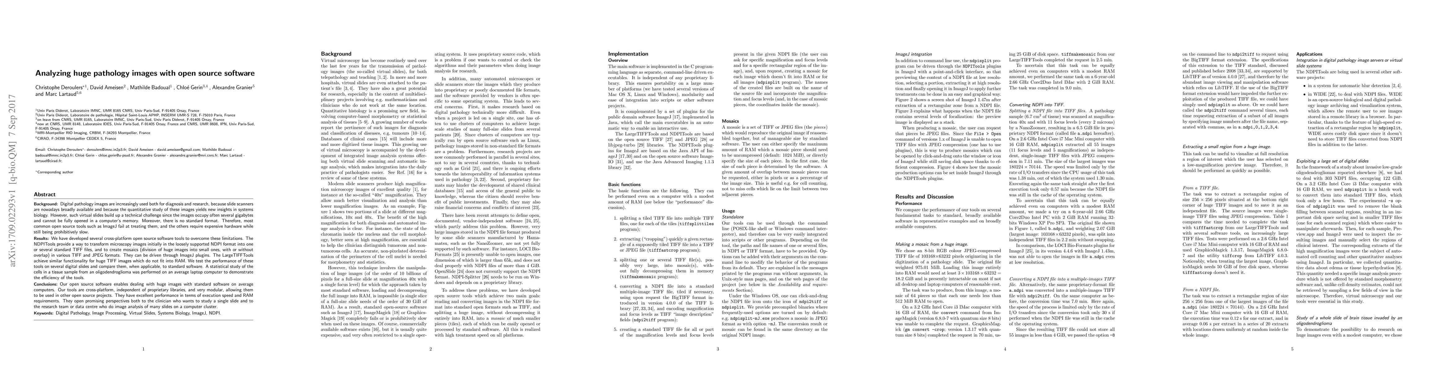 Backgr: Digital pathology images are increasingly used both for diagnosis and research, because slide scanners are nowadays broadly available and because the quantitative study of these images yields new insights in systems biology. However, such virtual slides build up a technical challenge since the images occupy often several gigabytes and cannot be fully opened in a computer's memory. Moreover, there is no standard format. Therefore, most common open source tools such as ImageJ fail at treating them, and the others require expensive hardware while still being prohibitively slow. Res: We have developed several cross-platform open source software tools to overcome these limitations. The NDPITools provide a way to transform microscopy images initially in the loosely supported NDPI format into one or several standard TIFF files, and to create mosaics (division of huge images into small ones, with or without overlap) in various TIFF and JPEG formats. They can be driven through ImageJ plugins. The LargeTIFFTools achieve similar functionality for huge TIFF images which do not fit into RAM. We test the performance of these tools on several digital slides and compare them, when applicable, to standard software. A statistical study of the cells in a tissue sample from an oligodendroglioma was performed on an average laptop computer to demonstrate the efficiency of the tools. Concl: Our open source software enables dealing with huge images with standard software on average computers. Our tools are cross-platform, independent of proprietary libraries, and very modular, allowing them to be used in other open source projects. They have excellent performance in terms of execution speed and RAM requirements. They open promising perspectives both to the clinician who wants to study a single slide and to the research team or data centre who do image analysis of many slides on a computer cluster.