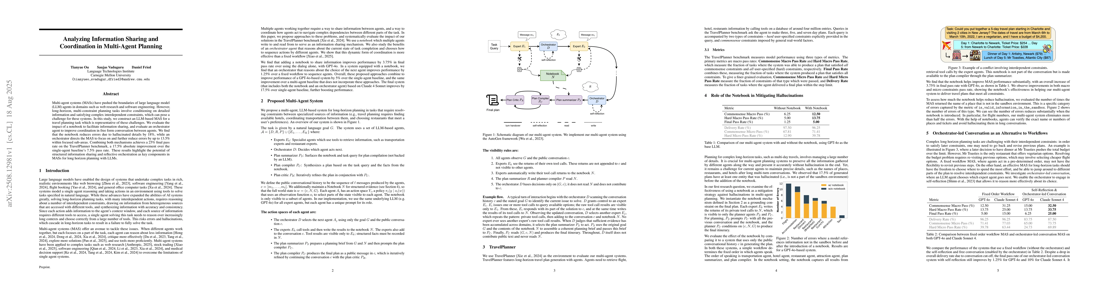 Multi-agent systems (MASs) have pushed the boundaries of large language model (LLM) agents in domains such as web research and software engineering. However, long-horizon, multi-constraint planning tasks involve conditioning on detailed information and satisfying complex interdependent constraints, which can pose a challenge for these systems. In this study, we construct an LLM-based MAS for a travel planning task which is representative of these challenges. We evaluate the impact of a notebook to facilitate information sharing, and evaluate an orchestrator agent to improve coordination in free form conversation between agents. We find that the notebook reduces errors due to hallucinated details by 18%, while an orchestrator directs the MAS to focus on and further reduce errors by up to 13.5% within focused sub-areas. Combining both mechanisms achieves a 25% final pass rate on the TravelPlanner benchmark, a 17.5% absolute improvement over the single-agent baseline's 7.5% pass rate. These results highlight the potential of structured information sharing and reflective orchestration as key components in MASs for long horizon planning with LLMs.