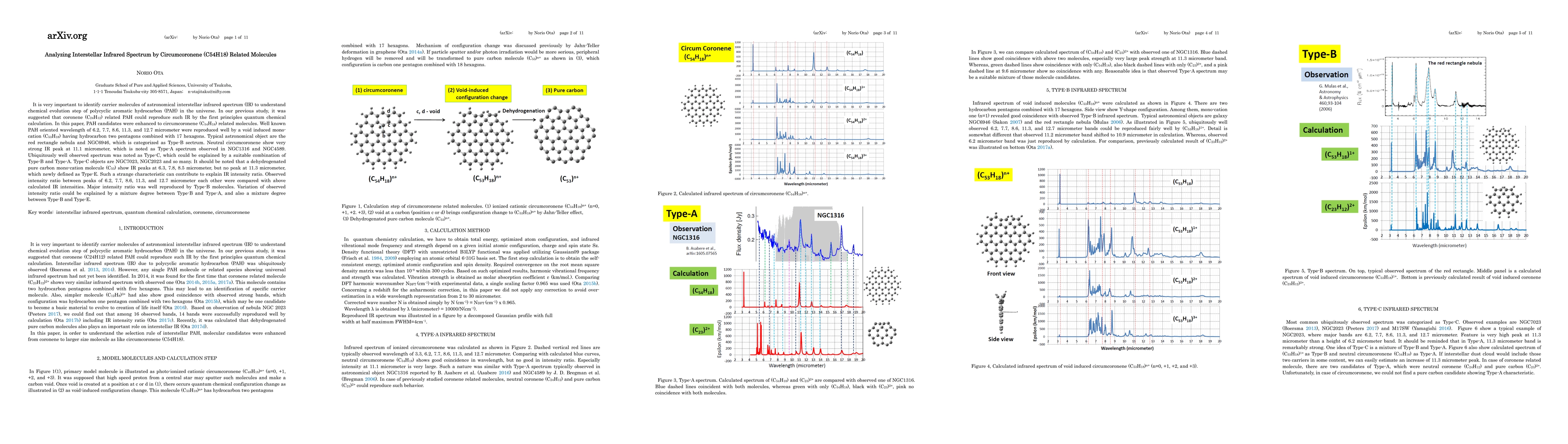 It is very important to identify carrier molecules of astronomical interstellar infrared spectrum (IR) to understand chemical evolution step of polycyclic aromatic hydrocarbon (PAH) in the universe. In our previous study, it was suggested that coronene (C24H12) related PAH could reproduce such IR by the first principles quantum chemical calculation. In this paper, PAH candidates were enhanced to circumcoronene (C54H18) related molecules. Well known PAH oriented wavelength of 6.2, 7.7, 8.6, 11.3, and 12.7 micrometer were reproduced well by a void induced mono-cation (C53H18) having hydrocarbon two pentagons combined with 17 hexagons. Typical astronomical object are the red rectangle nebula and NGC6946, which is categorized as Type-B sectrum. Neutral circumcoronene show very strong IR peak at 11.1 micrometer, which is noted as Type-A spectrum observed in NGC1316 and NGC4589. Ubiquitously well observed spectrum was noted as Type-C, which could be explained by a suitable combination of Type-B and Type-A. Type-C objects are NGC7023, NGC2023 and so many. It should be noted that a dehydrogenated pure carbon mono-cation molecule (C53) show IR peaks at 6.3, 7.8, 8.5 micrometer, but no peak at 11.3 micrometer, which newly defined as Type-E. Such a strange characteristic can contribute to explain IR intensity ratio. Observed intensity ratio between peaks of 6.2, 7.7, 8.6, 11.3, and 12.7 micrometer each other were compared with above calculated IR intensities. Major intensity ratio was well reproduced by Type-B molecules. Variation of observed intensity ratio could be explained by a mixture degree between Type-B and Type-A, and also a mixture degree between Type-B and Type-E.
