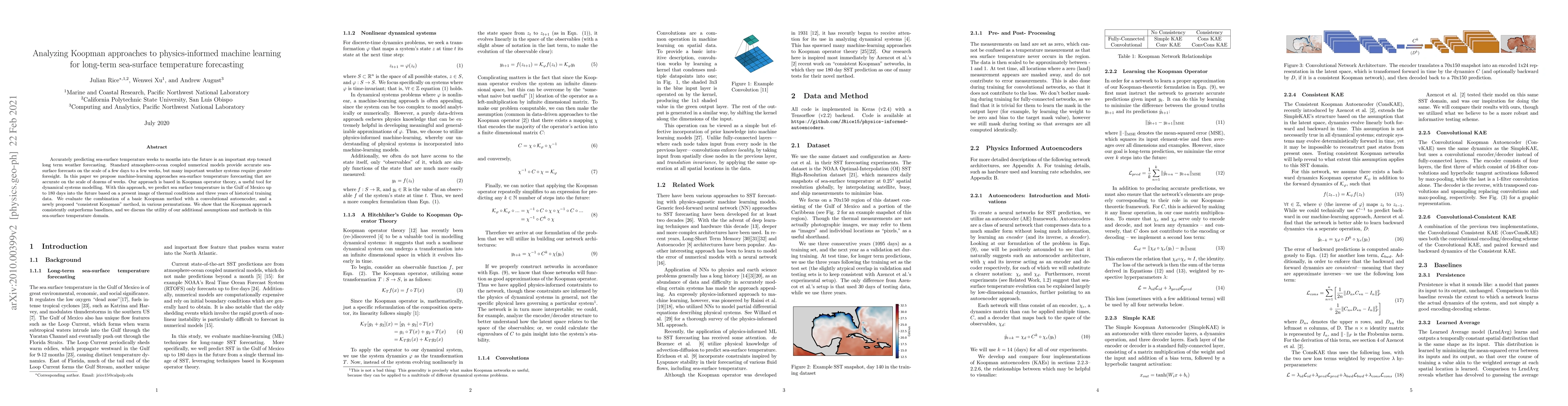 Accurately predicting sea-surface temperature weeks to months into the future is an important step toward long term weather forecasting. Standard atmosphere-ocean coupled numerical models provide accurate sea-surface forecasts on the scale of a few days to a few weeks, but many important weather systems require greater foresight. In this paper we propose machine-learning approaches sea-surface temperature forecasting that are accurate on the scale of dozens of weeks. Our approach is based in Koopman operator theory, a useful tool for dynamical systems modelling. With this approach, we predict sea surface temperature in the Gulf of Mexico up to 180 days into the future based on a present image of thermal conditions and three years of historical training data. We evaluate the combination of a basic Koopman method with a convolutional autoencoder, and a newly proposed "consistent Koopman" method, in various permutations. We show that the Koopman approach consistently outperforms baselines, and we discuss the utility of our additional assumptions and methods in this sea-surface temperature domain.