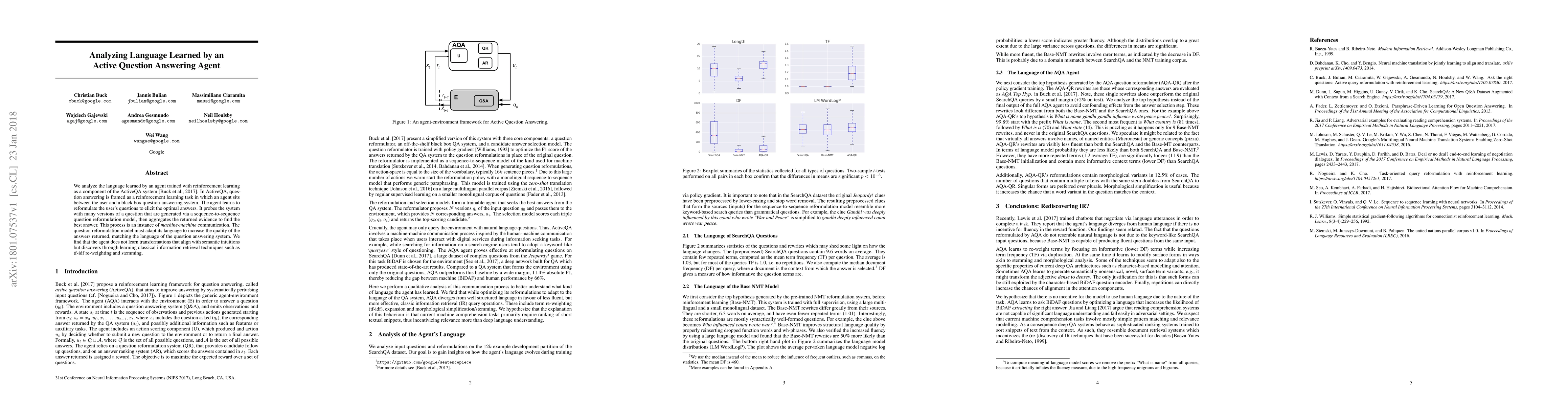 This paper examines the language learned by an agent in the ActiveQA system, which reformulates user questions to improve answers from a black box question-answering system using reinforcement learning. The agent employs classical information retrieval techniques like tf-idf re-weighting and stemming, rather than semantically intuitive transformations.