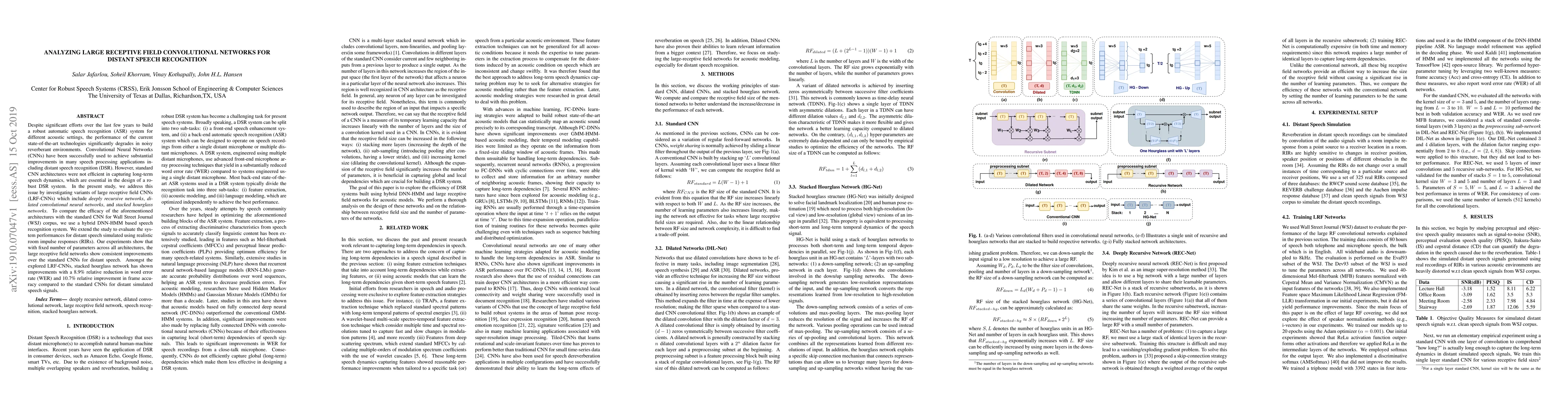 This paper investigates large receptive field convolutional networks (LRF-CNNs) for distant speech recognition, showing that they outperform standard CNNs in noisy environments. The stacked hourglass network, among the explored LRF-CNNs, achieved an 8.9% relative reduction in word error rate and a 10.7% improvement in frame accuracy for distant speech signals.